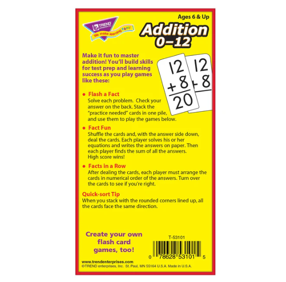 Content-rich math cards do their job, teaching students new skills in a fun way. This educational aid develops basic addition skills 0-12. Self-checking, answers on card backs. Sturdy cards and storage box. Students will delight in mastering new skills. No-see-through cards with quick-sorting, rounded corners. 91 cards, 3" x 6".