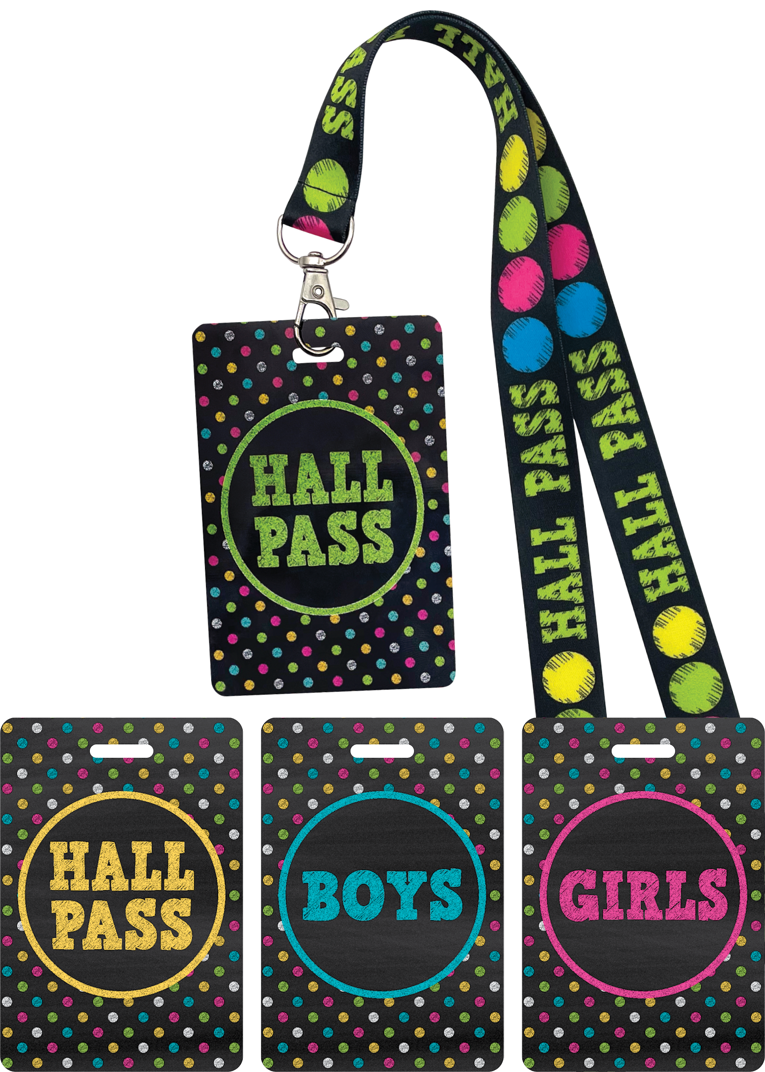 These hall passes are the perfect blend of functionality, convenience, and style for your classroom. Each durable hall pass is double-sided with a sturdy swiveling metal clasp and safety breakaway clip. Included are 2 ÒHALL PASSÓ passes, 1 ÒGIRLSÓ pass, and 1 ÒBOYSÓ pass, each with a matching fabric lanyard.4 durable, double-sided passes (2 hall passes, 1 boys pass, and 1 girls pass) ¥ Matching fabric lanyards with safety breakaway clips ¥ Sturdy, swiveling metal clasp ¥ Easy to clean and sanitize