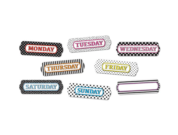 Magnetic Die-Cut Timesavers & Labels, Black and White Patterns, Days of the Week. 8 pieces, 4.25" x 1.5" size. Write-on/ wipe-off surface. Use on magnetic whiteboards, lockers, refrigerators & other steel surfaces. Write names, goals, assignments, etc, underneath each column header.