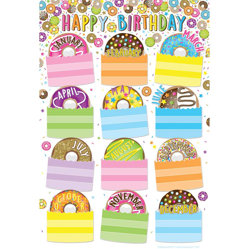 Smart Poly® Chart 13"x19", DonutFetti® Birthdays. Write-on/ wipe-off heavy duty washable all poly chart, no lamination needed. Use with dry erase or water based markers and washable crayons. Use with Ashley Smart Tak®, pins, tacks, staples, etc. to hang in the classroom. Great for reusable learning. Match with coordinating DonutFetti® charts and decor. Glossy surface, .45mm.