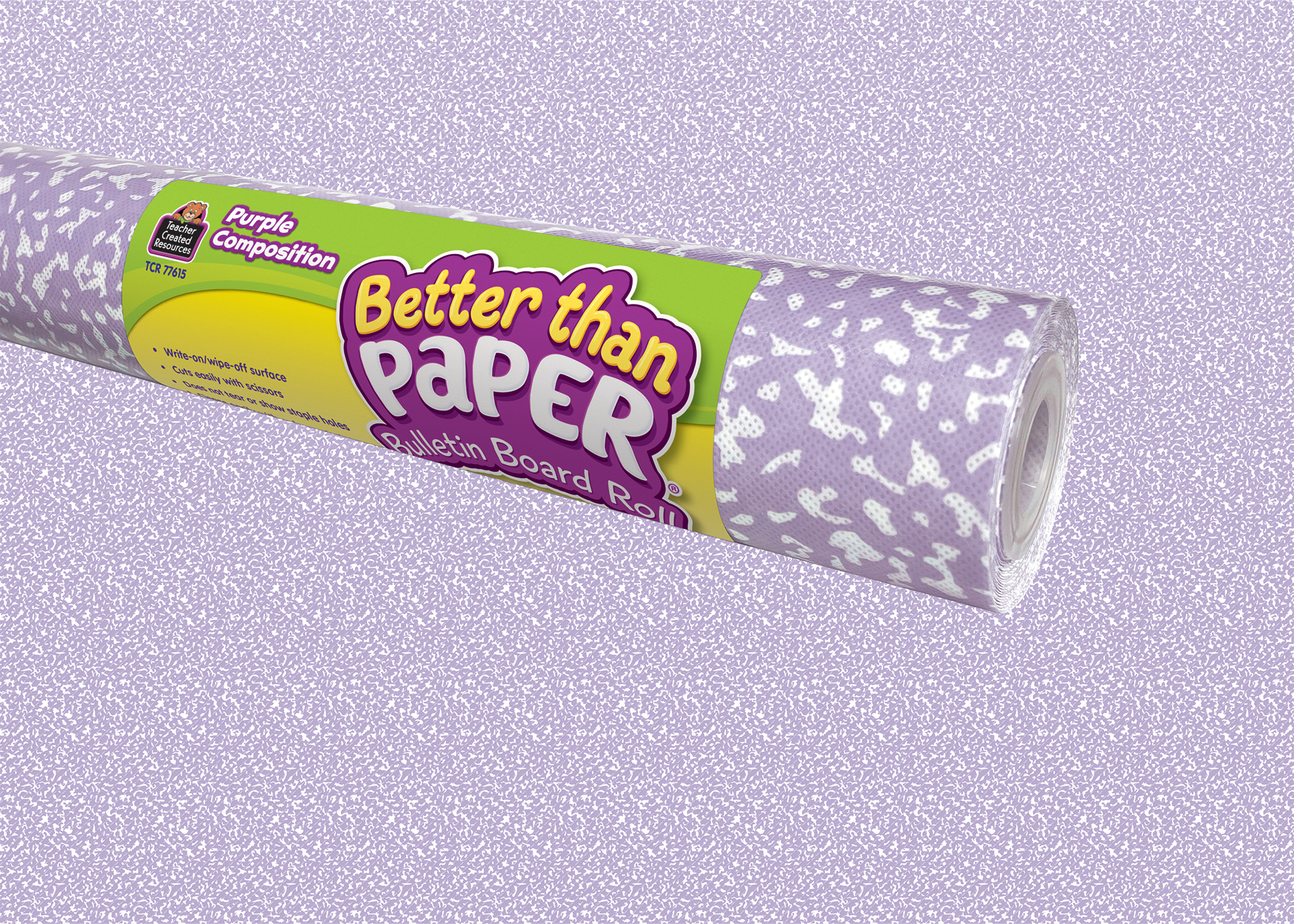 Add a pop of color to any classroom with this bulletin board background. Featuring a fresh twist on a classic print, this Composition Purple Better Than Paper resists wrinkles and tears, simplifying bulletin board setup. Cut with scissors to create your desired size and shape. Attach border trim, accents, posters, and student work effortlessly using staples or tape, without worrying about ripping or leaving unsightly holes. Each roll measures 4' x 12', so you’ll have plenty to hang around the classroom.