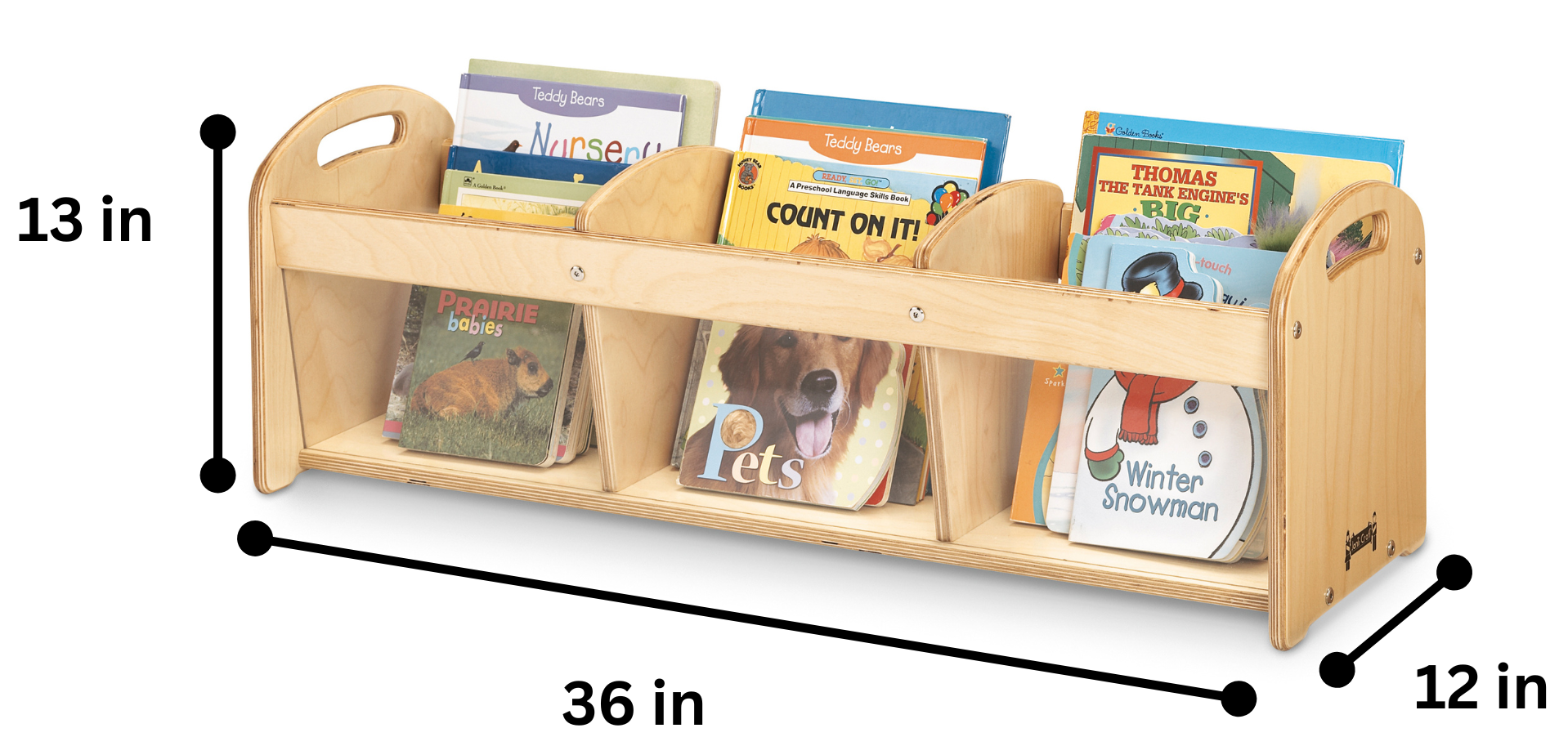 See-thru panels encourage independent toddlers to do it themselves. Three partitions just the right height for books or toys.
