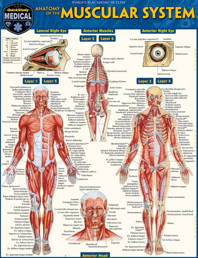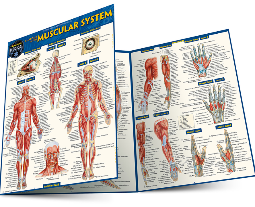 The human muscular system illustrated with over 1400 labeled parts, up to five layers of muscle, plus eight views or angles for the most comprehensive, portable, and easy to reference source - all for an unbeatable price. Durable lamination protects and enhances the body art by award-winning and best-selling medical illustrator Vincent Perez whose life mission is cataloging the beauty and detail of our complicated body systems. With over 10 million QuickStudy anatomy guides in print spanning over 30 years this best-selling guide has helped medical students achieve their goals, medical professionals plus their patients with a visual aid, health experts like athletic trainers and yoga instructors, and anyone wanting to know the details of our amazing and intricate machine.