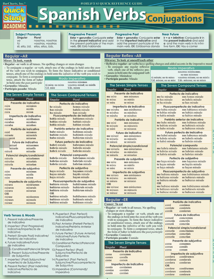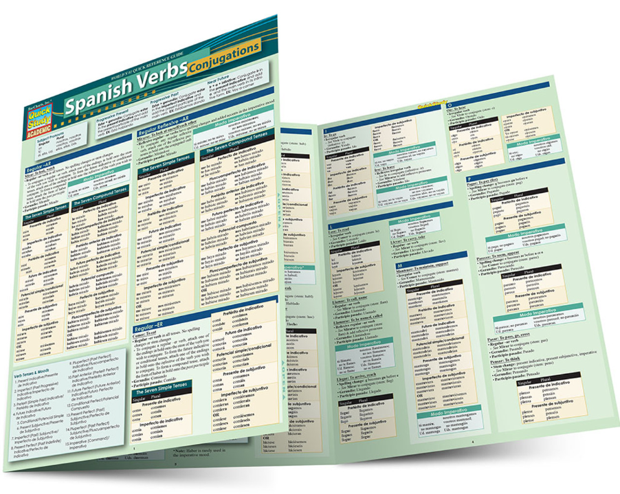 The key to learning the Spanish language is the ability to conjugate Spanish verbs. This 6-page laminated guide offers easy-to-read tables of conjugations for the 15 verb tenses and moods, with the changes bolded for quick reference. Sixty verbs and their meanings are included, with the irregular tenses and moods listed for each verb. Using the example conjugations, this guide becomes a powerful key to unlocking Spanish for communication.