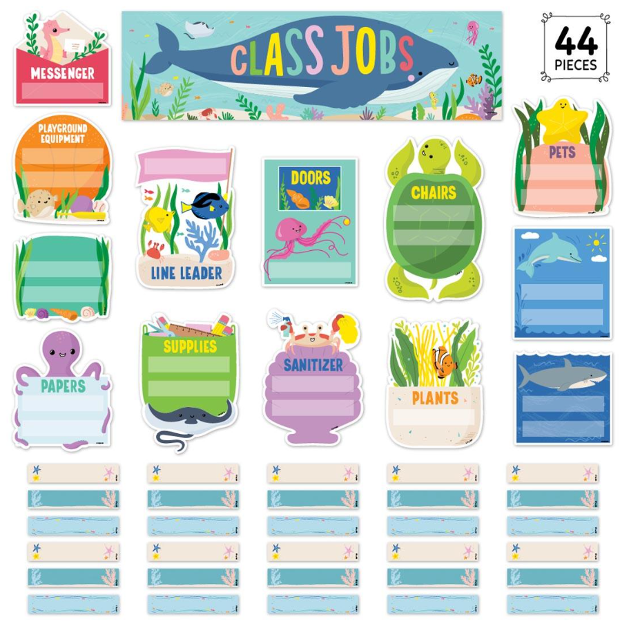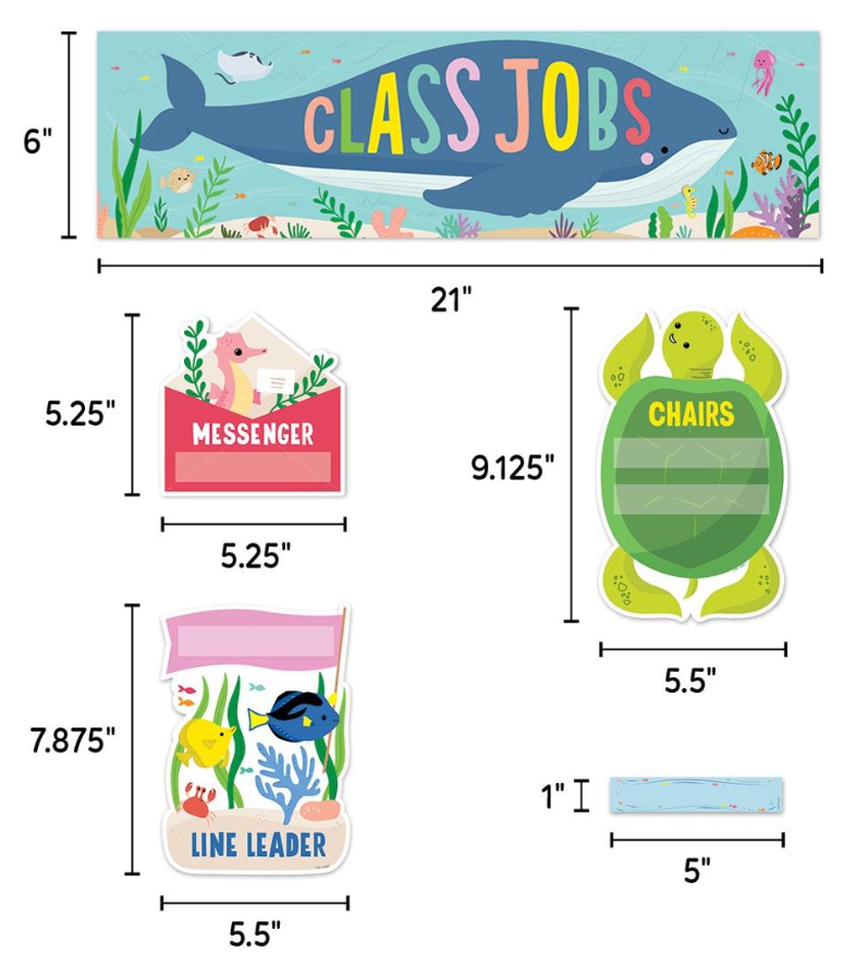 Establish a classroom community in which everyone pitches in. Class job display set is a wonderful way to help students develop a sense of pride and ownership, plus responsibility and interdependence. Includes a 21x6" class jobs header; 10 job signs (chairs, doors, line leader, messenger, papers, pets, plants, playground equipment, sanitizer and supplies); 3 blank, customizable job signs; and 30 student name pieces. 44 pieces in all.