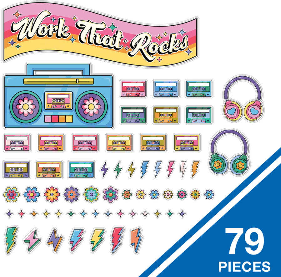 Use the cassette tapes to create name labels for students, while using the other retro décor to accentuate student work displays that will inspire them to keep up the good work.