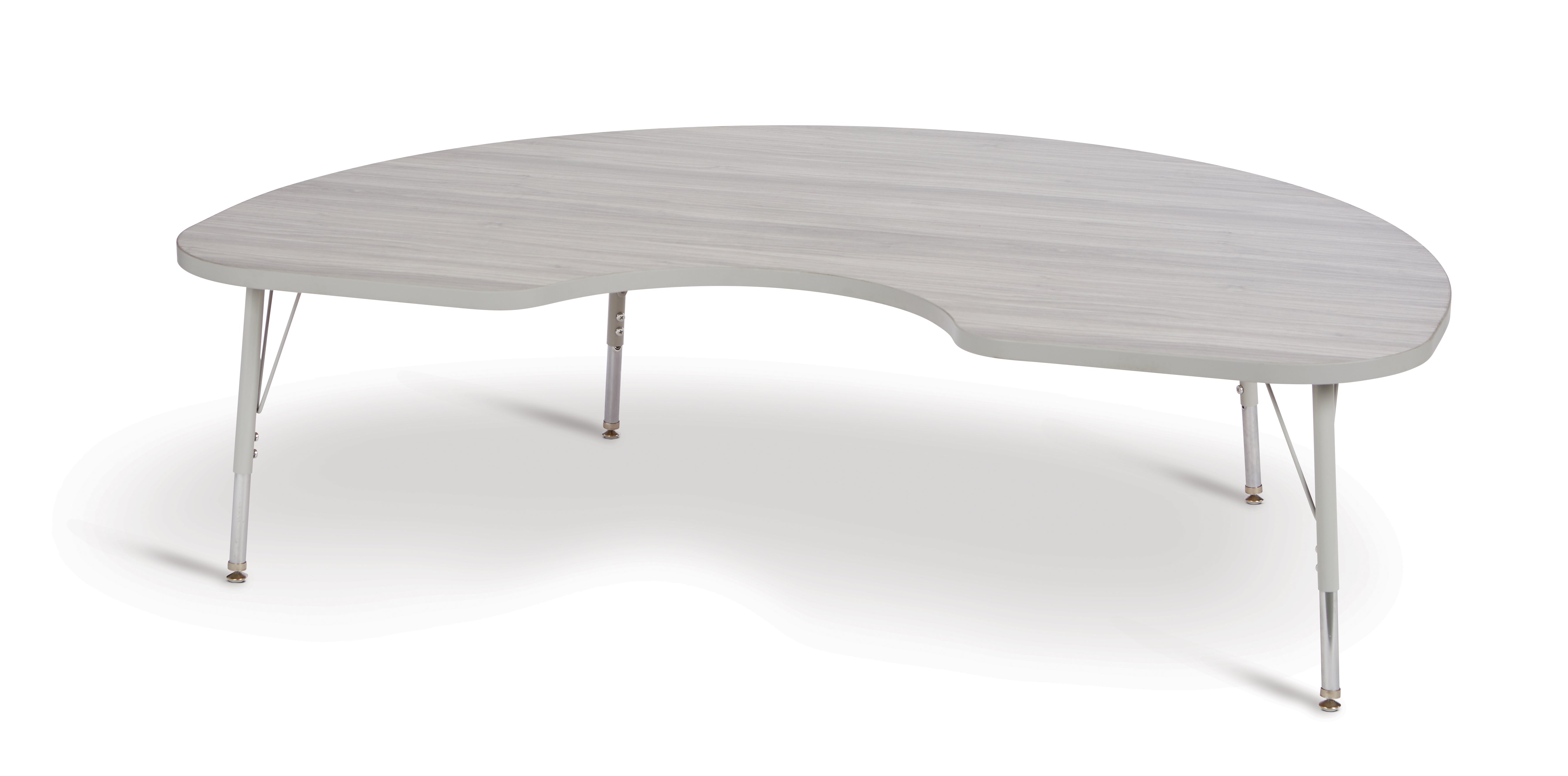 Educators can easily interact with individual children without disturbing others with Kidney Tables. Accommodates up to 8 chairs. The legs feature glides that reduce noise, prevent snags, and resist rust. Driftwood Gray laminate tabletop with Gray TRUEdge and Gray legs.KYDZSafe edges. KYDZStrong construction. TRUEdge. Choose from multiple tabletop and TRUEdge color combinations. Thermally Fused Laminate tabletops 1-1/8â thick. Quick mount legs with minimal assembly. Legs adjust in one-inch increments with the extra-safe dual-screw leg adjustability system. Helpful Hint: Most children require elementary size tables tiny tables typically fit children just 1 to 2 years old. Adjusts from 15" to 24" high. See cleaning recommendations at www.jonti-craft.com/cleaning.Product Height (inches):15-24Product Width (inches):72Product Depth (inches: 48