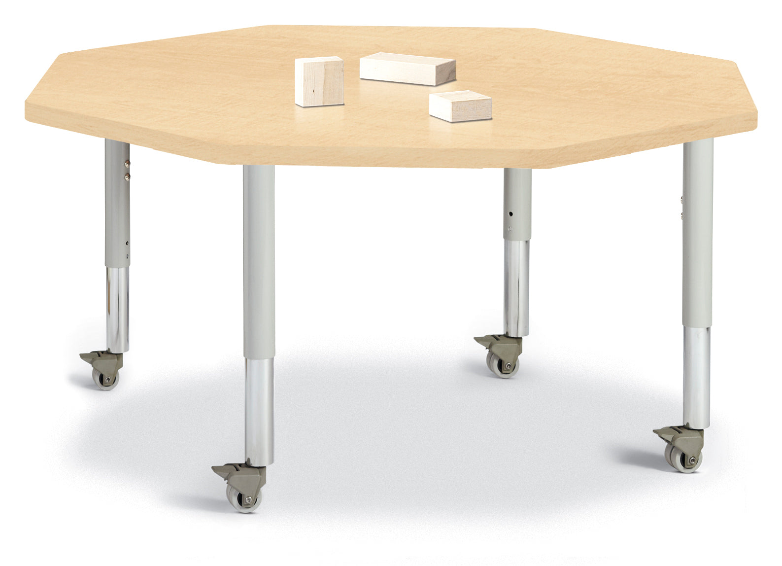 Kids will enjoy learning together while having their own space with the Octagon Table. Accommodates up to 8 chairs. The legs adjust from 20â to 31â high, are 2â thick, and feature heavy-duty casters. Maple tabletop with maple TRUEdge, gray legs, and gray casters.KYDZSafe edges. KYDZStrong construction. TRUEdge. Choose from multiple tabletop and TRUEdge color combinations. Thermally Fused Laminate tabletops 1-1/8â thick. Quick mount legs with minimal assembly. Legs adjust in one-inch increments with the extra-safe dual-screw leg adjustability system. Helpful Hint: Most children require elementary size tables tiny tables typically fit children just 1 to 2 years old. See cleaning recommendations at www.jonti-craft.com/cleaning.Product Height (inches):20-31Product Width (inches):48Product Depth (inches: 48