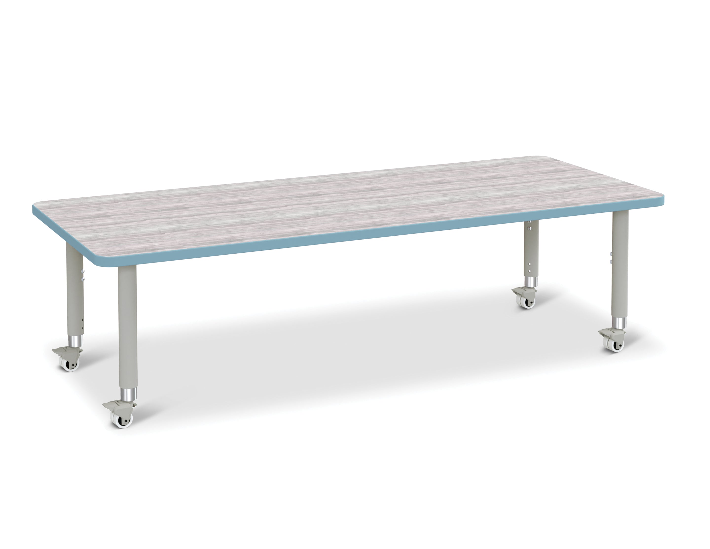 The perfect table for any occasion. Accommodates up to 10 chairs. The legs adjust from 20â to 31â high, are 2â thick, and feature heavy-duty casters. Driftwood Gray tabletop with Coastal Blue TRUEdge, gray legs, and gray casters.KYDZSafe edges. KYDZStrong construction. TRUEdge. Choose from multiple tabletop and TRUEdge color combinations. Thermally Fused Laminate tabletops 1-1/8â thick. Quick mount legs with minimal assembly. Legs adjust in one-inch increments with the extra-safe dual-screw leg adjustability system. Helpful Hint: Most children require elementary size tables tiny tables typically fit children just 1 to 2 years old. Adjusts from 18â to 29â high (or 20â to 31â with casters). See cleaning recommendations at www.jonti-craft.com/cleaning.Product Height (inches):20-31Product Width (inches):72Product Depth (inches: 30