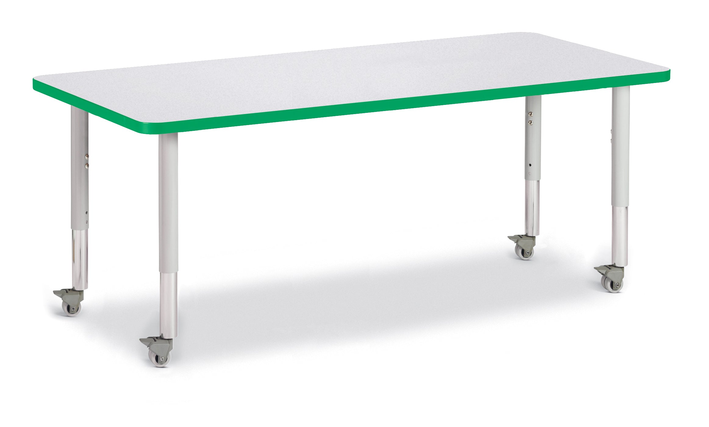 The perfect table for any occasion. Accommodates up to 10 chairs. The legs adjust from 20â to 31â high, are 2â thick, and feature heavy-duty casters. Freckled gray laminate tabletop with green TRUEdge, gray legs, and gray casters.KYDZSafe edges. KYDZStrong construction. TRUEdge. Choose from multiple tabletop and TRUEdge color combinations. Thermally Fused Laminate tabletops 1-1/8â thick. Quick mount legs with minimal assembly. Legs adjust in one-inch increments with the extra-safe dual-screw leg adjustability system. Helpful Hint: Most children require elementary size tables tiny tables typically fit children just 1 to 2 years old. See cleaning recommendations at www.jonti-craft.com/cleaning.Product Height (inches):20-31Product Width (inches):72Product Depth (inches: 30