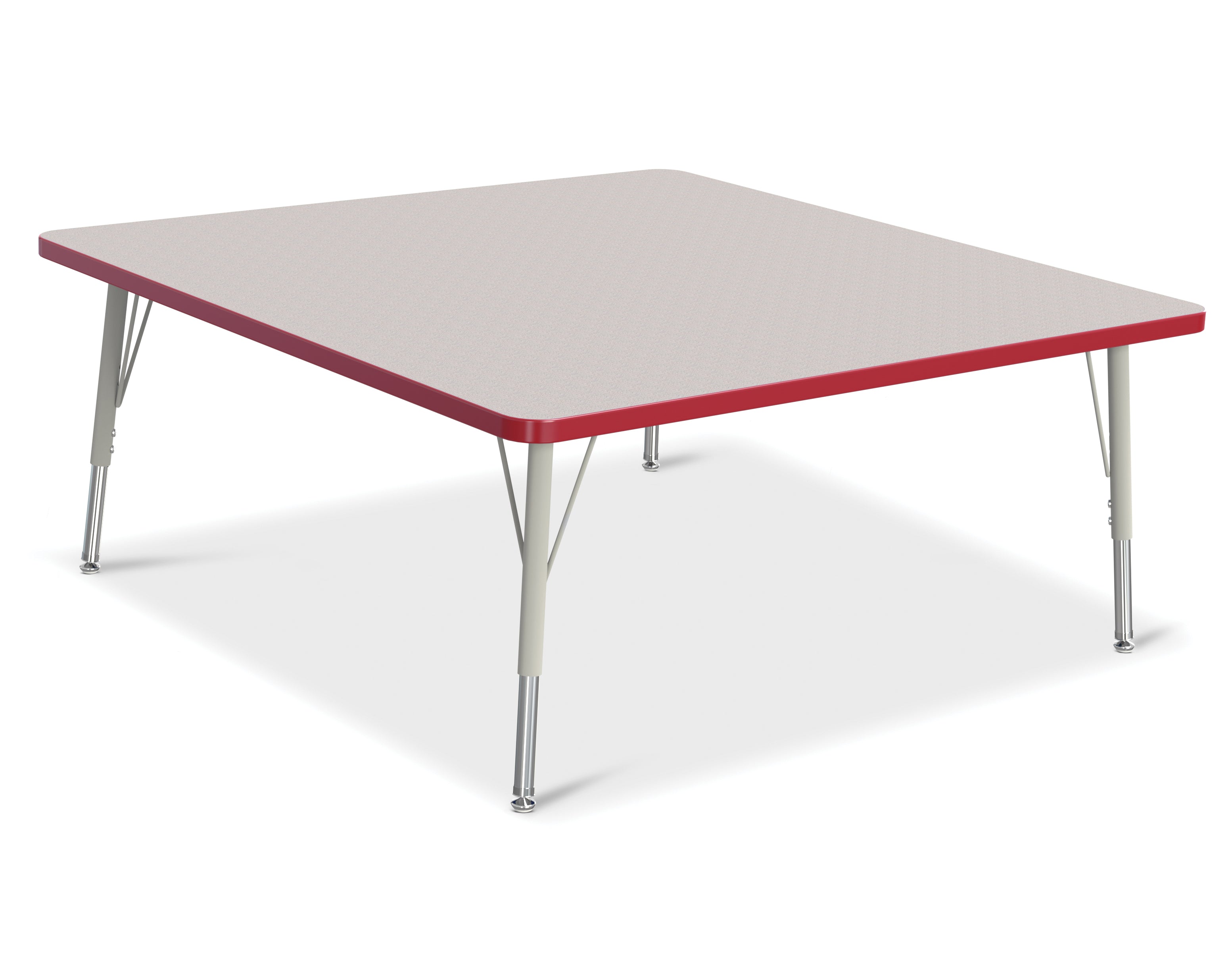 Keep it simple with a square table. Accommodates up to 8 chairs. The legs feature glides that reduce noise, prevent snags, and resist rust. Freckled gray laminate tabletop with red TRUEdge and gray legs.KYDZSafe edges. KYDZStrong construction. TRUEdge. Choose from multiple tabletop and TRUEdge color combinations. Thermally Fused Laminate tabletops 1-1/8â thick. Quick mount legs with minimal assembly. Legs adjust in one-inch increments with the extra-safe dual-screw leg adjustability system. Helpful Hint: Most children require elementary size tables tiny tables typically fit children just 1 to 2 years old. Adjusts from 15" to 24" high. See cleaning recommendations at www.jonti-craft.com/cleaning.Product Height (inches):15-24Product Width (inches):48Product Depth (inches: 48