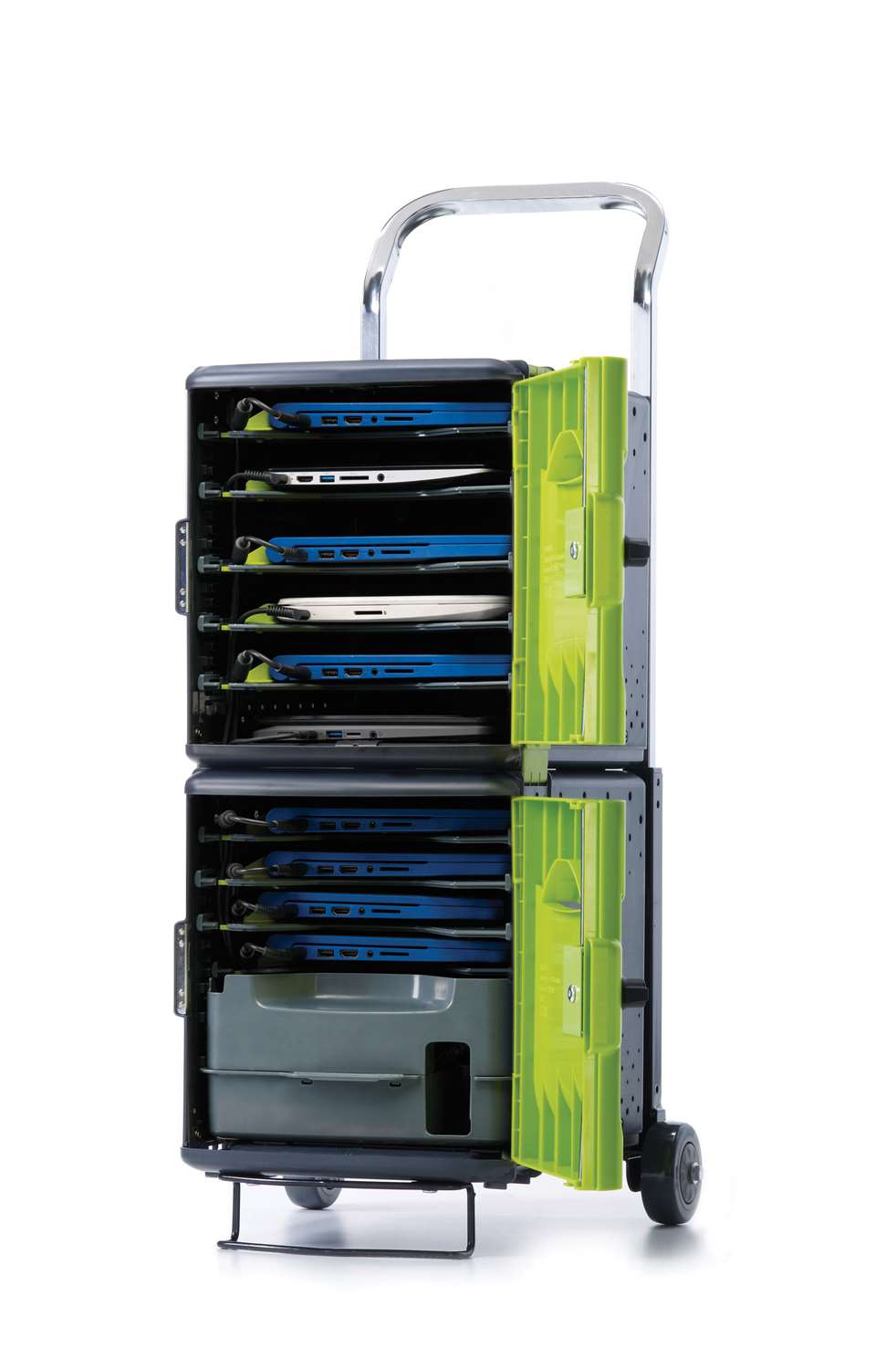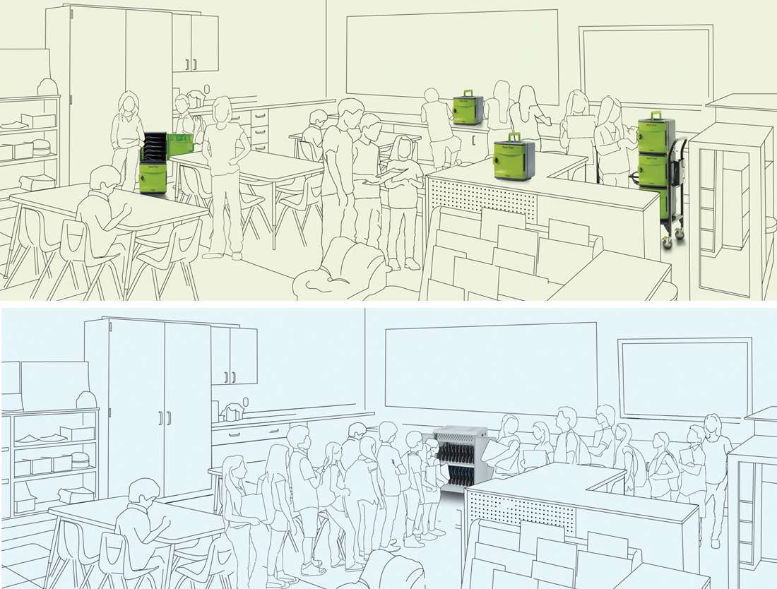 Trolleys are designed for devices on the move! They store and charge small sets of 10 iPads®, 11” Chromebooks™ and other tablets around a school. The adjustable handle and built-in casters ensure that students from grade three and up can take part in managing their devices. The Tech Tubs® can also be placed around the classroom to reduce deployment bottlenecks.