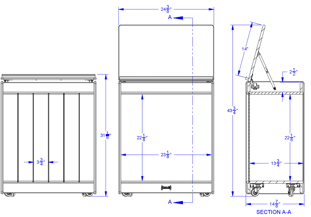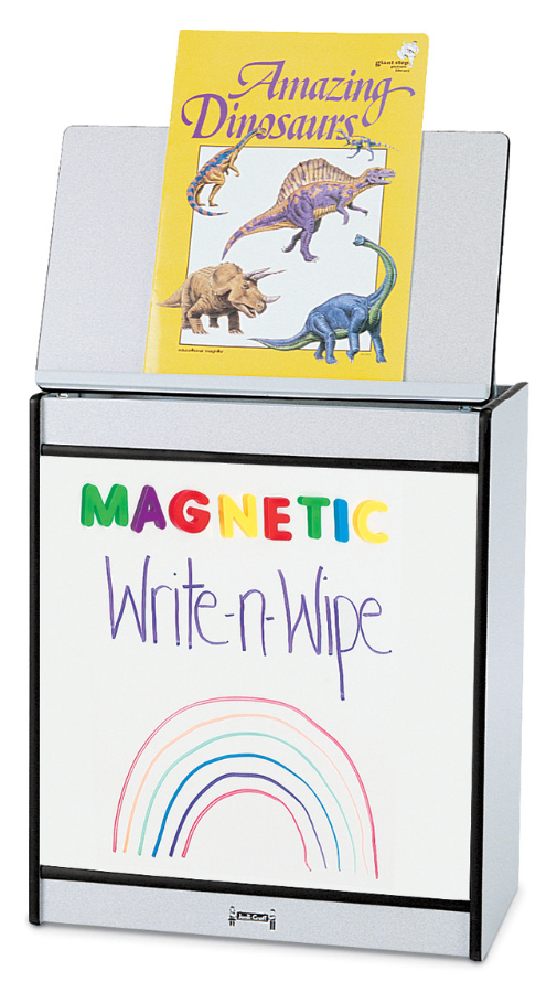 A Big Book language enrichment station on wheels! Easel folds down over storage space when not in use. Magnetic Write-n-Wipe front for adding to your story. Vertical big book partitions in back for storing a multitude of books. Overall approximately 43" height. Constructed of double-sided freckled gray laminate with black TRUEdge.