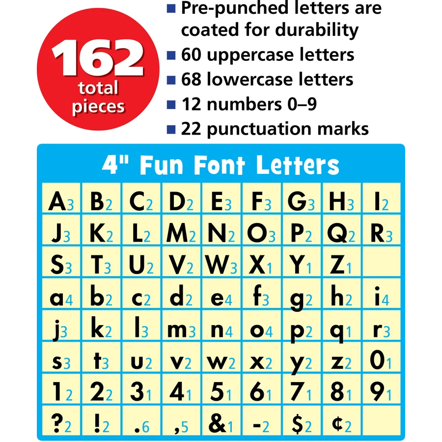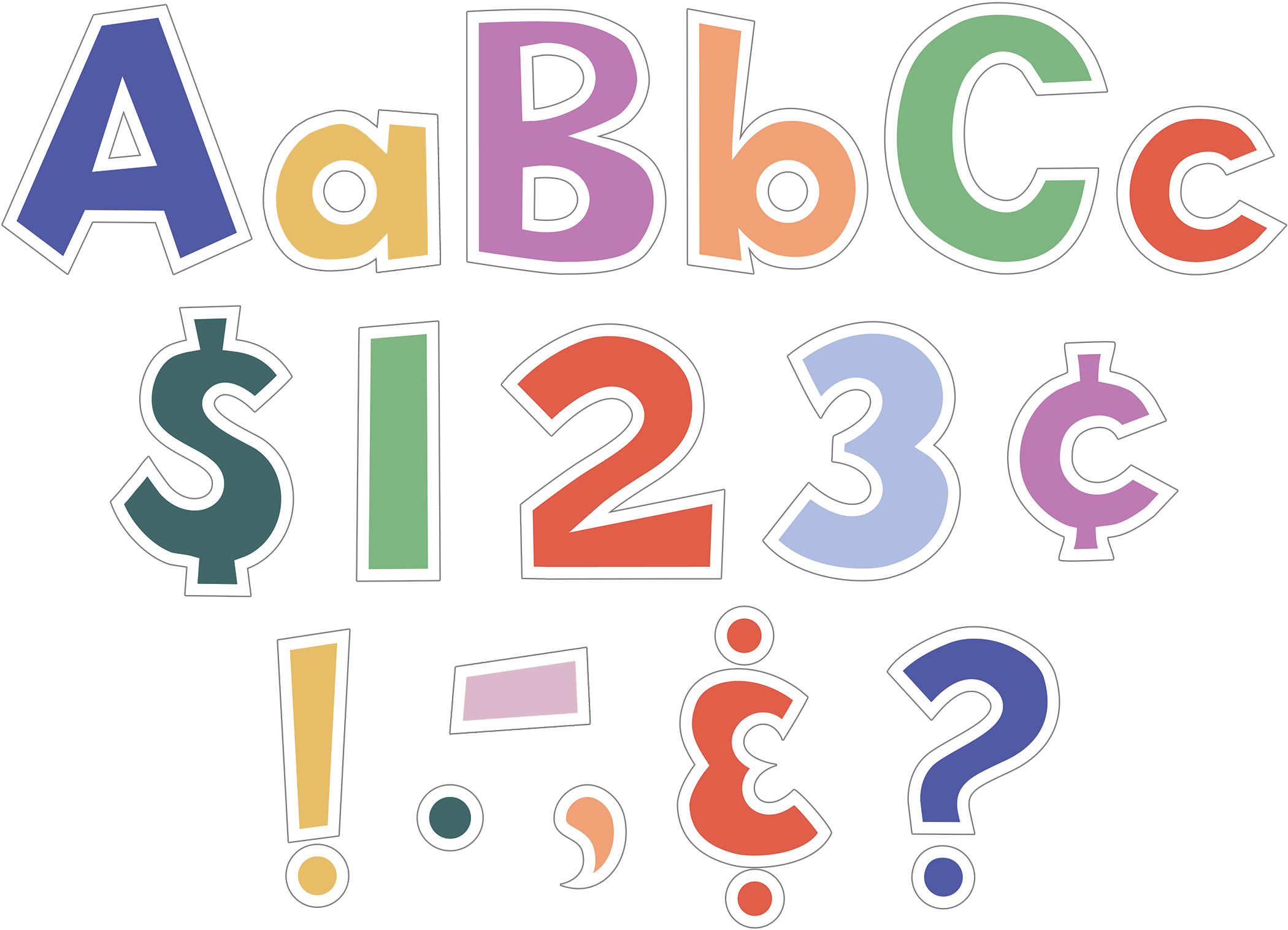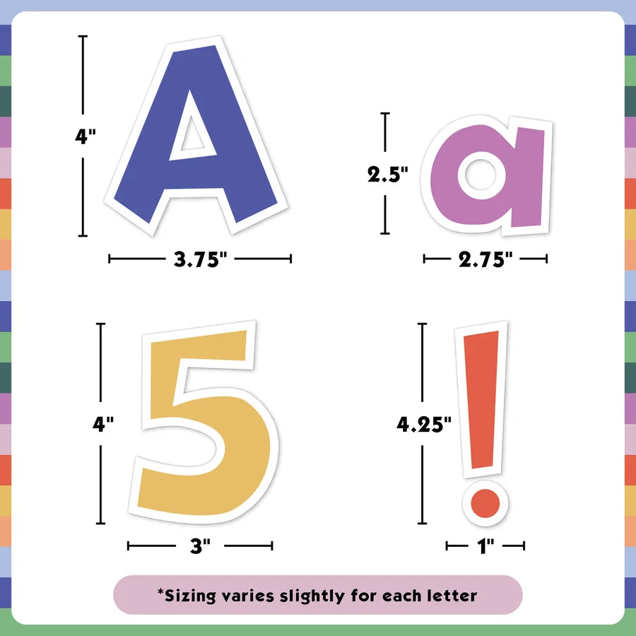 Elevate your classroom decor with these colorful letters. Featuring modern hues and a trendy font, these letters are ideal for creating bulletin boards, word walls, and visual displays. Use them to label centers or organize workspaces. Pair with backdrops, accents, and border trim to create one-of-a-kind bulletin boards that show off your personality and create a welcoming, energetic environment where students thrive. The set includes 162 punch-out pieces: 60 uppercase letters, 68 lowercase letters, 12 numerals (0–9), and 22 punctuation marks. Each piece measures about 4" tall. 162 total pieces.