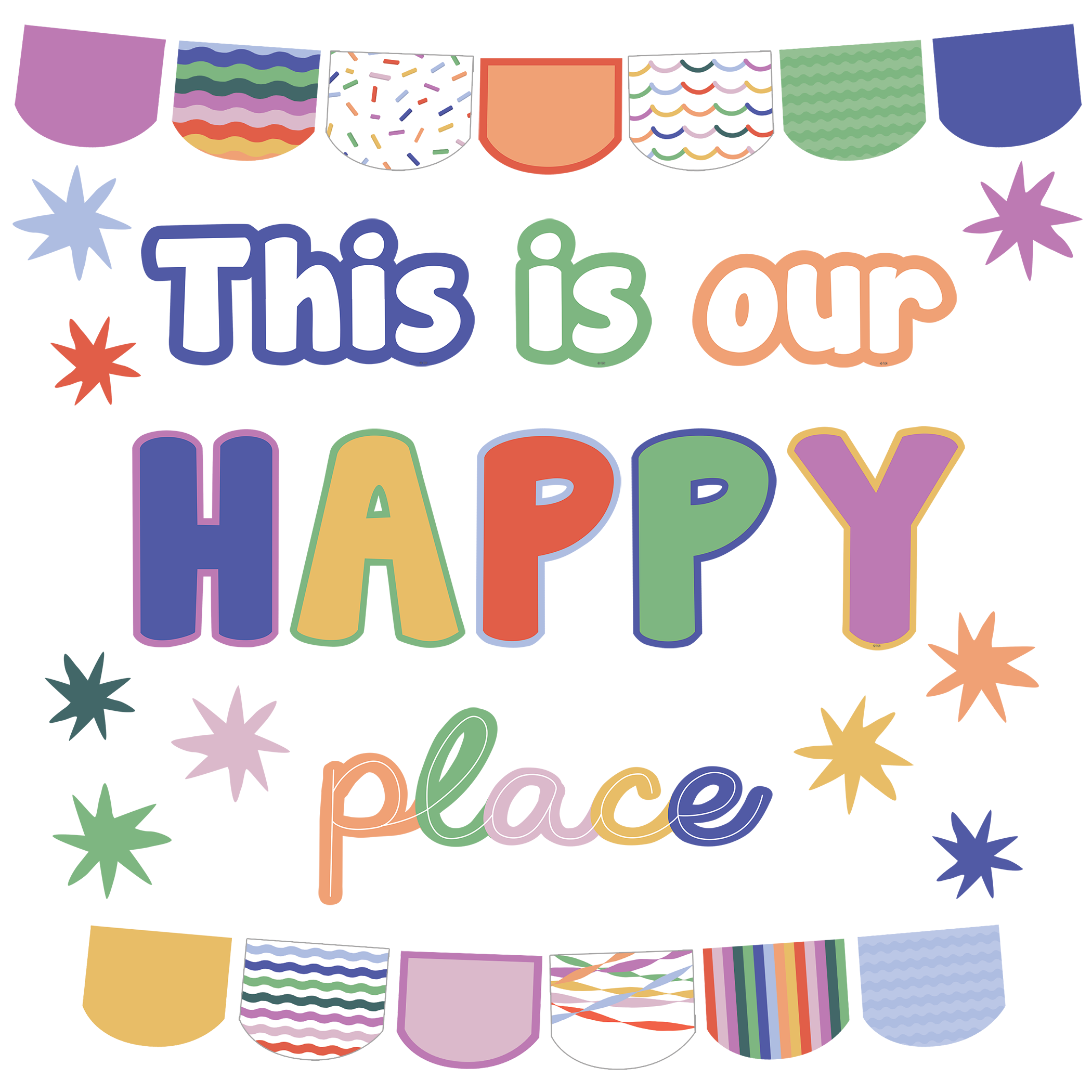 Foster a warm, welcoming vibe in your space with this bulletin board set. Featuring modern colors, trendy designs, and easy-to-read fonts, these accents bring a celebratory feel to your classroom. Sprinkle, streamer, scallop, and pom-pom designs invoke a party-like atmosphere. Made for teachers who love the little details, this mini bulletin board set has limitless uses in the classroom and beyond. 31 pieces total. The tallest HAPPY letter measures about 7".