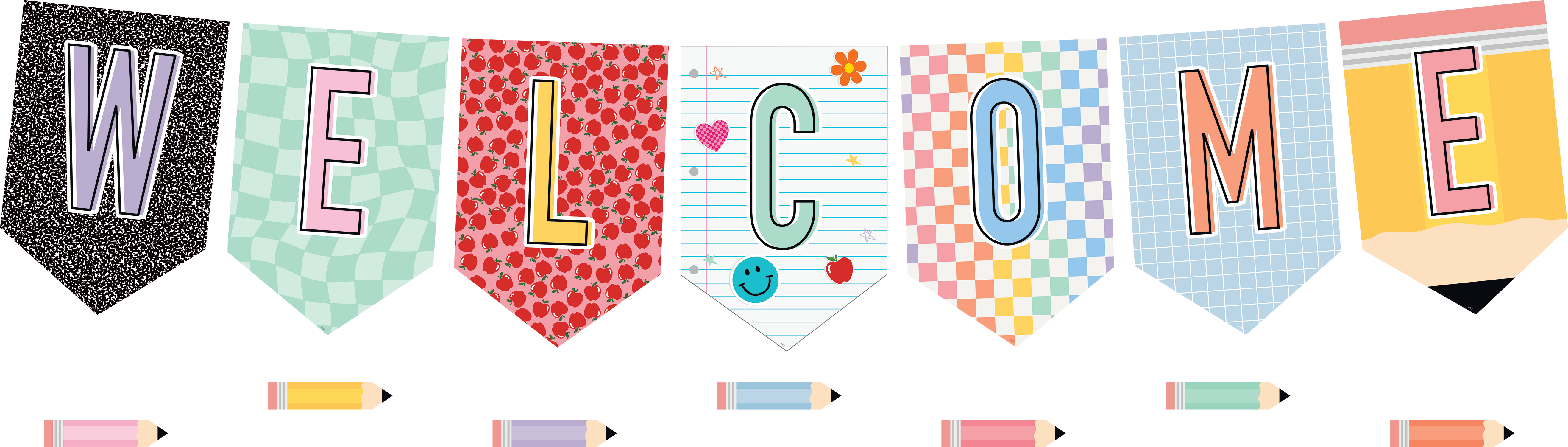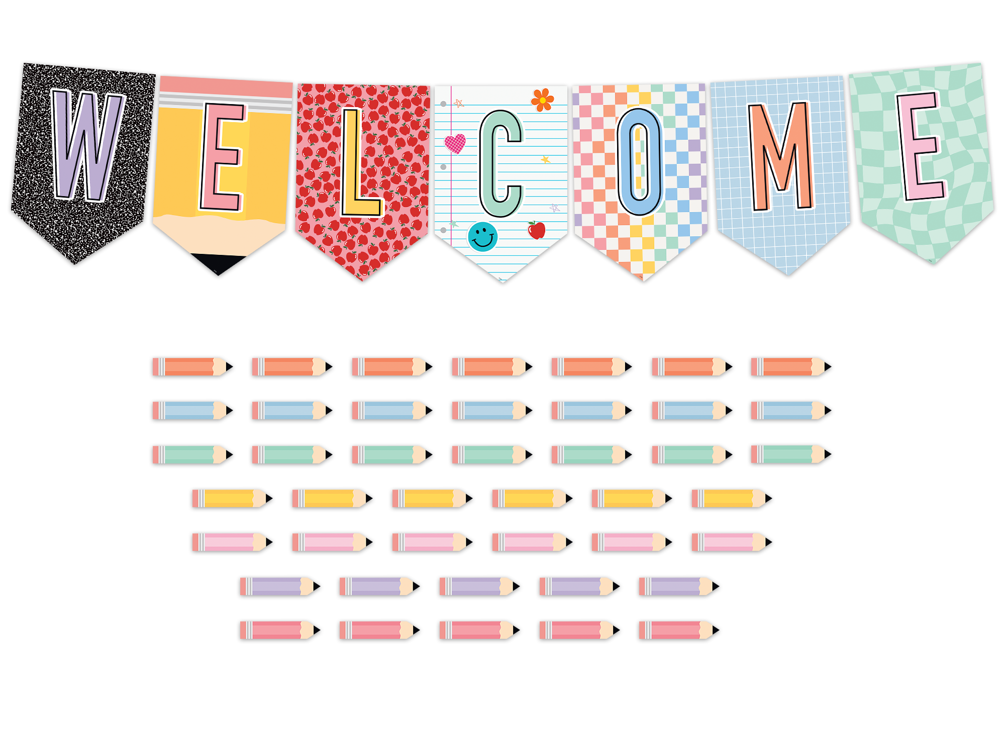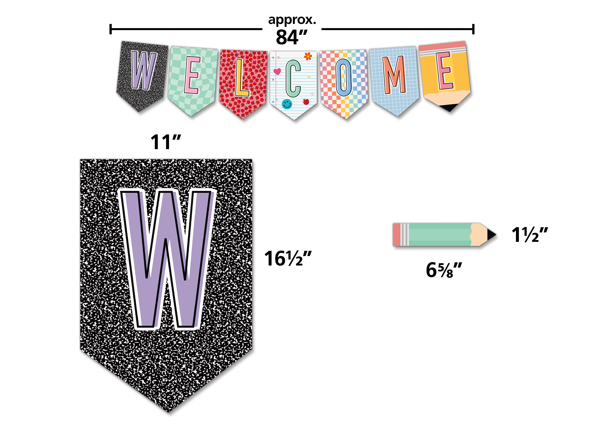 Welcome your students with a burst of color and playful patterns in this vibrant bulletin board set. The large letters create a welcome sign that no one can miss and add a fun, energetic touch to any classroom! Includes 43 multi-purpose blank pencil accents and a teacher’s guide. Largest pennant measures 10-1/4" x 13-1/2". 50 total pieces.