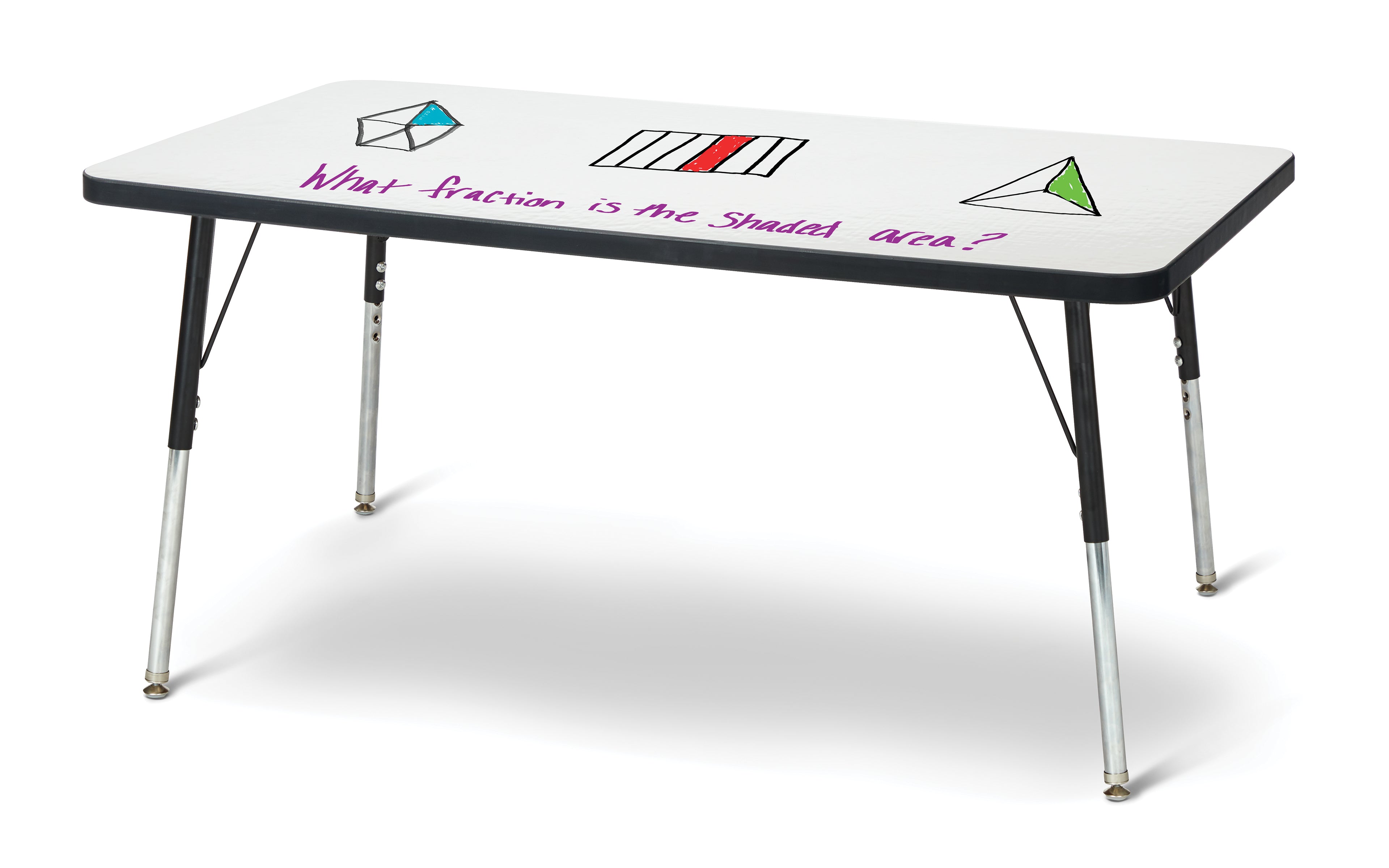 Finally a table where kids can draw directly on it! This markerboard table feature a Write-n-Wipe surface that encourage kids of all ages to get involved. The whiteboard tabletop makes it easy for children to take notes, draw, or even collaborate with others. With a high-pressure laminate surface, you can be sure that the dry erase surface will stand up to some heavy-duty learning. It’s stain resistant and features our famous TRUEdge in a rich black color. Comes with black legs containing glides that reduce noise, prevent snags, and resist rust. Accommodates up to 4 chairs.KYDZSafe edges. KYDZStrong construction. TRUEdge. Quick mount legs with minimal assembly. Available with standard or mobile legs. Upper leg powder coated. Thermally Fused Laminate tabletops 1-1/8â thick. High-pressure laminate Write-n-Wipe surface. Standard legs available in Tiny, Elementary and Adult heights. Helpful Hint: Most children require elementary size tables tiny tables typically fit children just 1 to 2 years old. Adjusts from 24" to 31" high. See cleaning recommendations at www.jonti-craft.com/cleaning.Product Height (inches):24-31Product Width (inches):48Product Depth (inches: 24