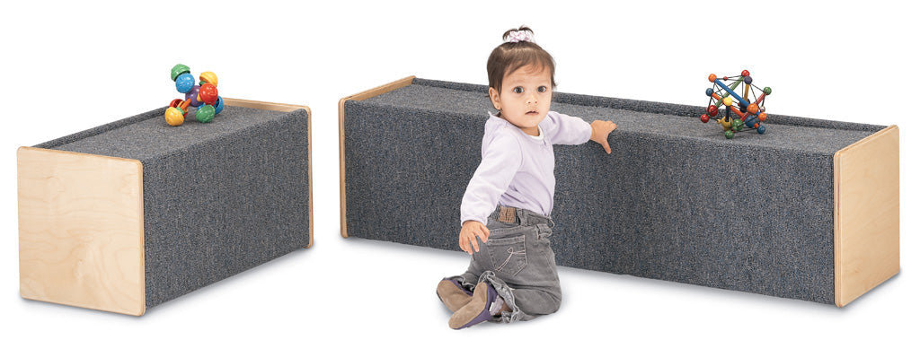 Little “cruisers" can develop balance and large motor skills using these carpeted boxes. Flip them over for storing toys. Two sizes to choose from. Carpet color may vary. 44 lbs. 13" High x 49.5" Wide x 13" Deep. Lifetime warranty.