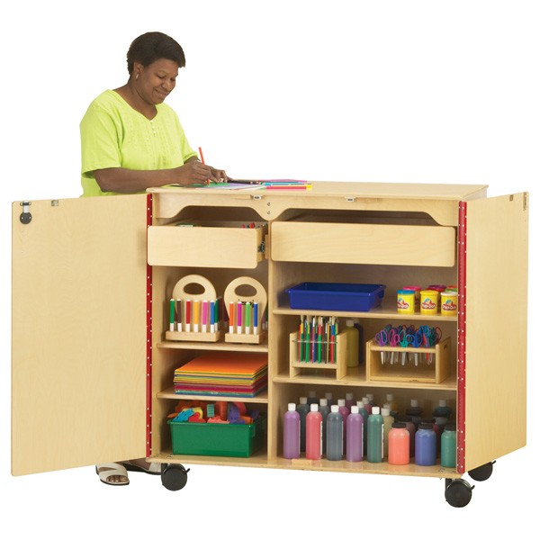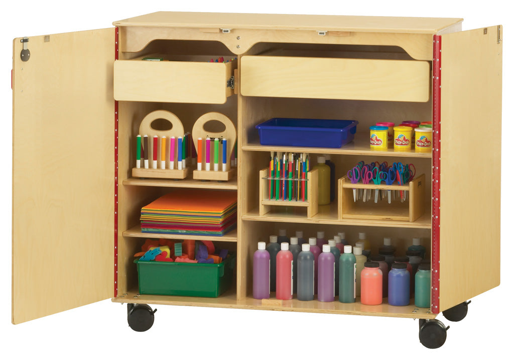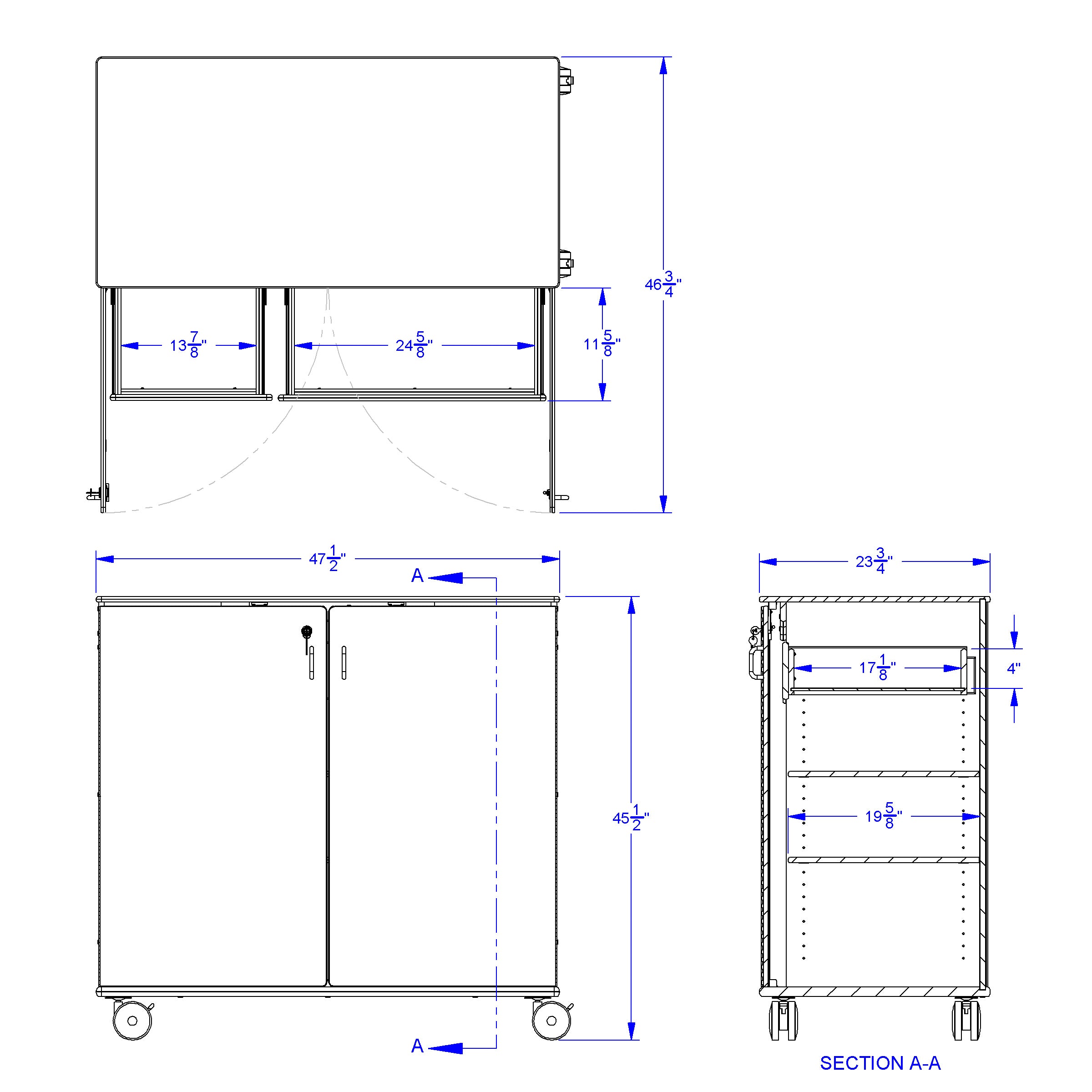 Secure storage and quick access has never been so easy. Lock-n-key include. Two drawers and four adjustable shelves . Extra heavy duty locking casters. 206 lbs. 46" High x 45" Wide x 24" Deep. Lifetime warranty.