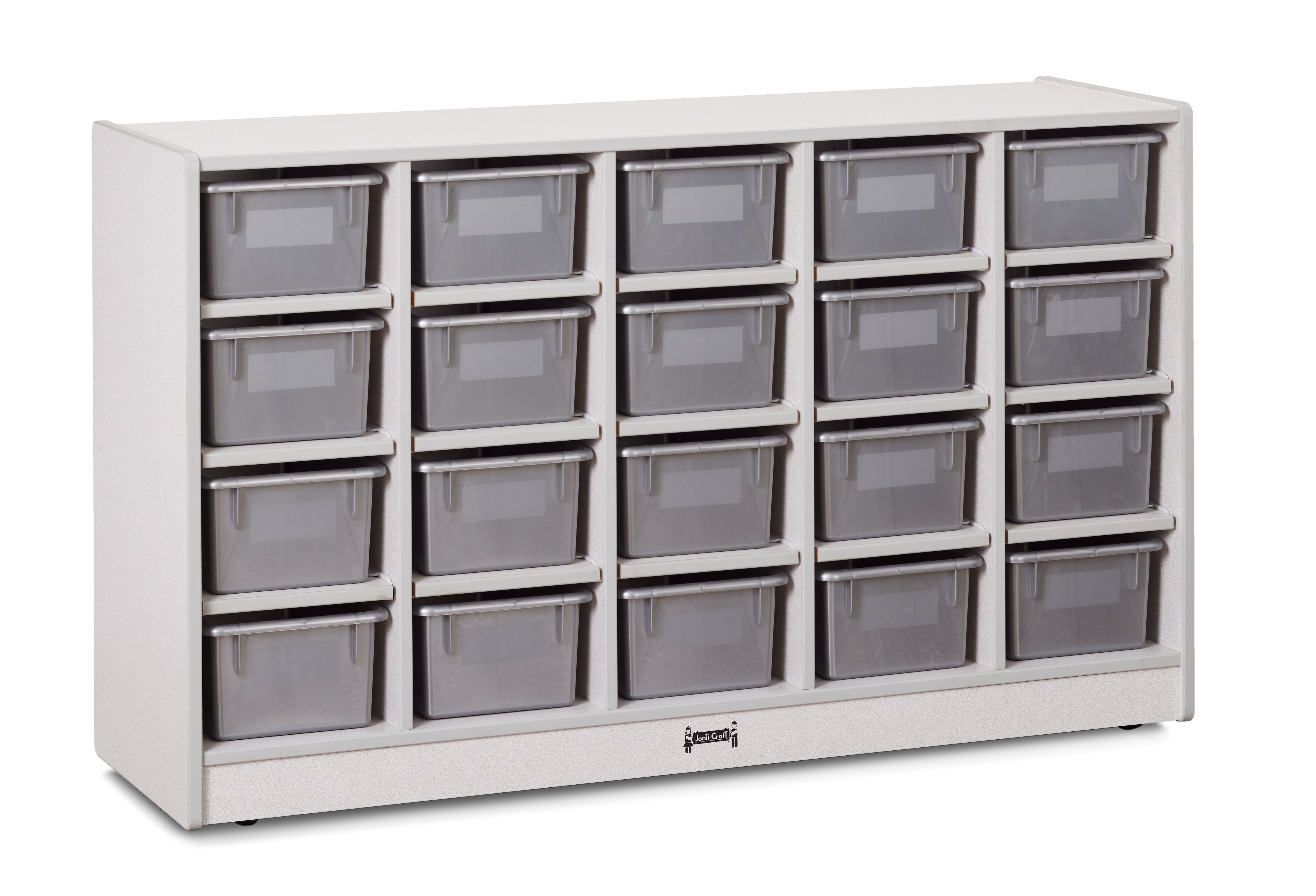 Encourage an organized classroom with this mobile Cubbie-Tray unit. Includes 20 Cubbie-Trays for storing manipulatives, supplies, and more. Constructed of double-sided freckled gray laminate with gray TRUEdge.KYDZSafe edges. KYDZStrong construction. TRUEdge. MAXBracket. Constructed of 5/8Ó thick freckled-gray Thermally Fused Laminate (TFL). Contact your Jonti-Craft dealer for specific bin colors. Standard Write-n-Wipe recessed backs. Back options available. See cleaning recommendations at www.jonti-craft.com/cleaning.