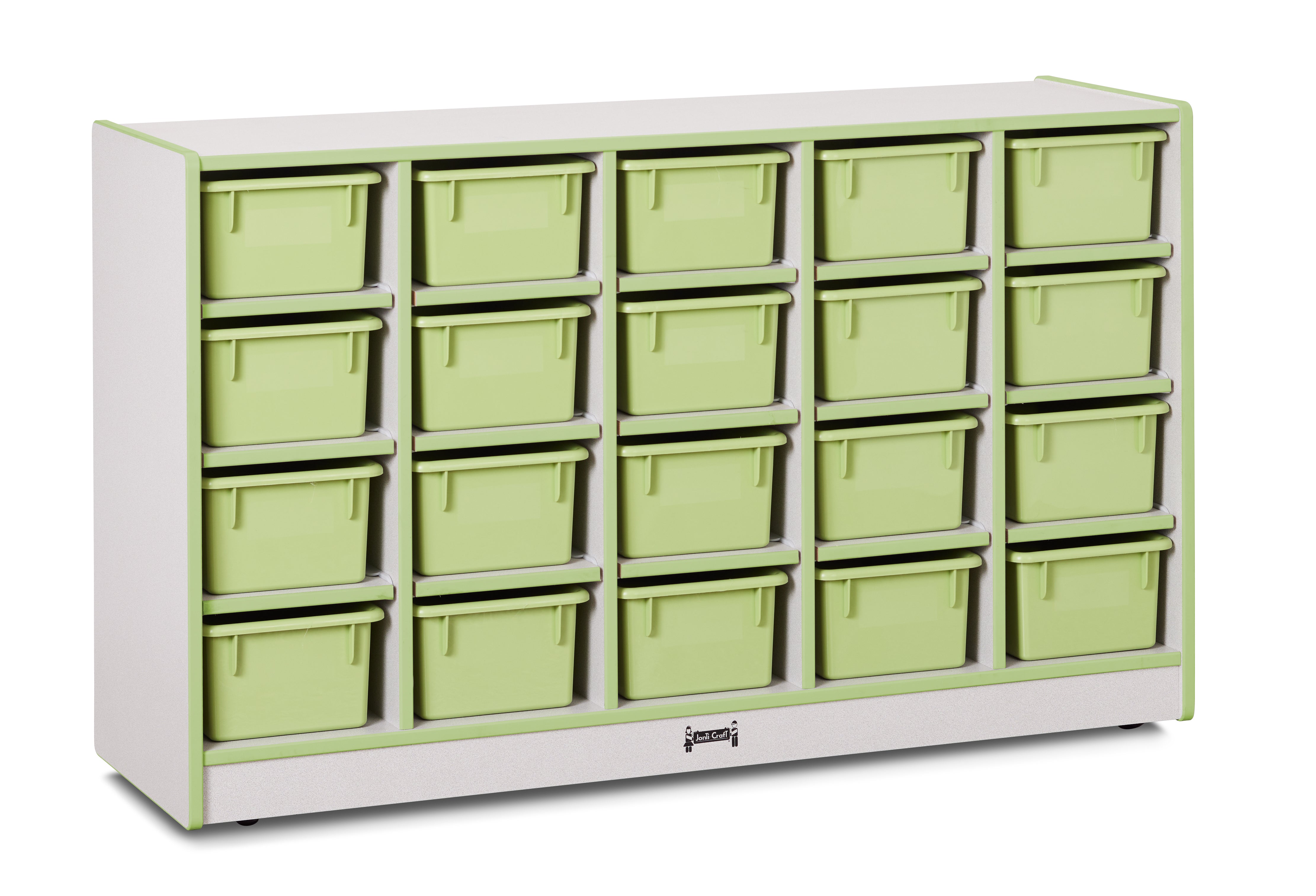 Encourage an organized classroom with this mobile Cubbie-Tray unit. Includes 20 Cubbie-Trays for storing manipulatives, supplies, and more. Constructed of double-sided freckled gray laminate with key lime TRUEdge.KYDZSafe edges. KYDZStrong construction. TRUEdge. MAXBracket. Constructed of 5/8Ó thick freckled-gray Thermally Fused Laminate (TFL). Contact your Jonti-Craft dealer for specific bin colors. Standard Write-n-Wipe recessed backs. Back options available. See cleaning recommendations at www.jonti-craft.com/cleaning.