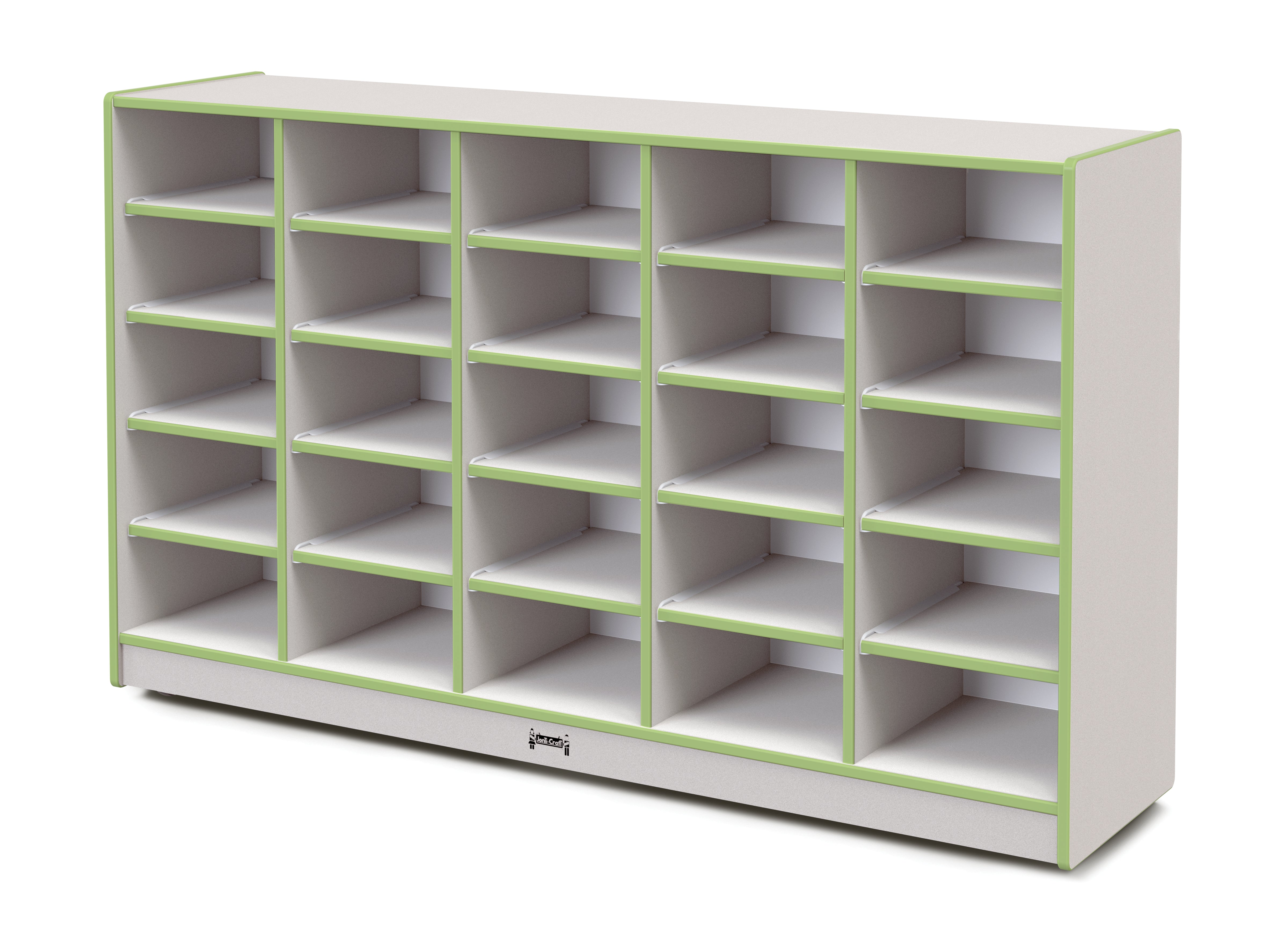 Organize art supples, papers, or manipulatives with this mobile unit! Features 25 Tub openings that papers (8.5" x 11") can lay flat, without curled edges. Tubs not included. Constructed of double-sided freckled gray laminate with key lime TRUEdge.KYDZSafe edges. KYDZStrong construction. TrueEdge. MAXBracket