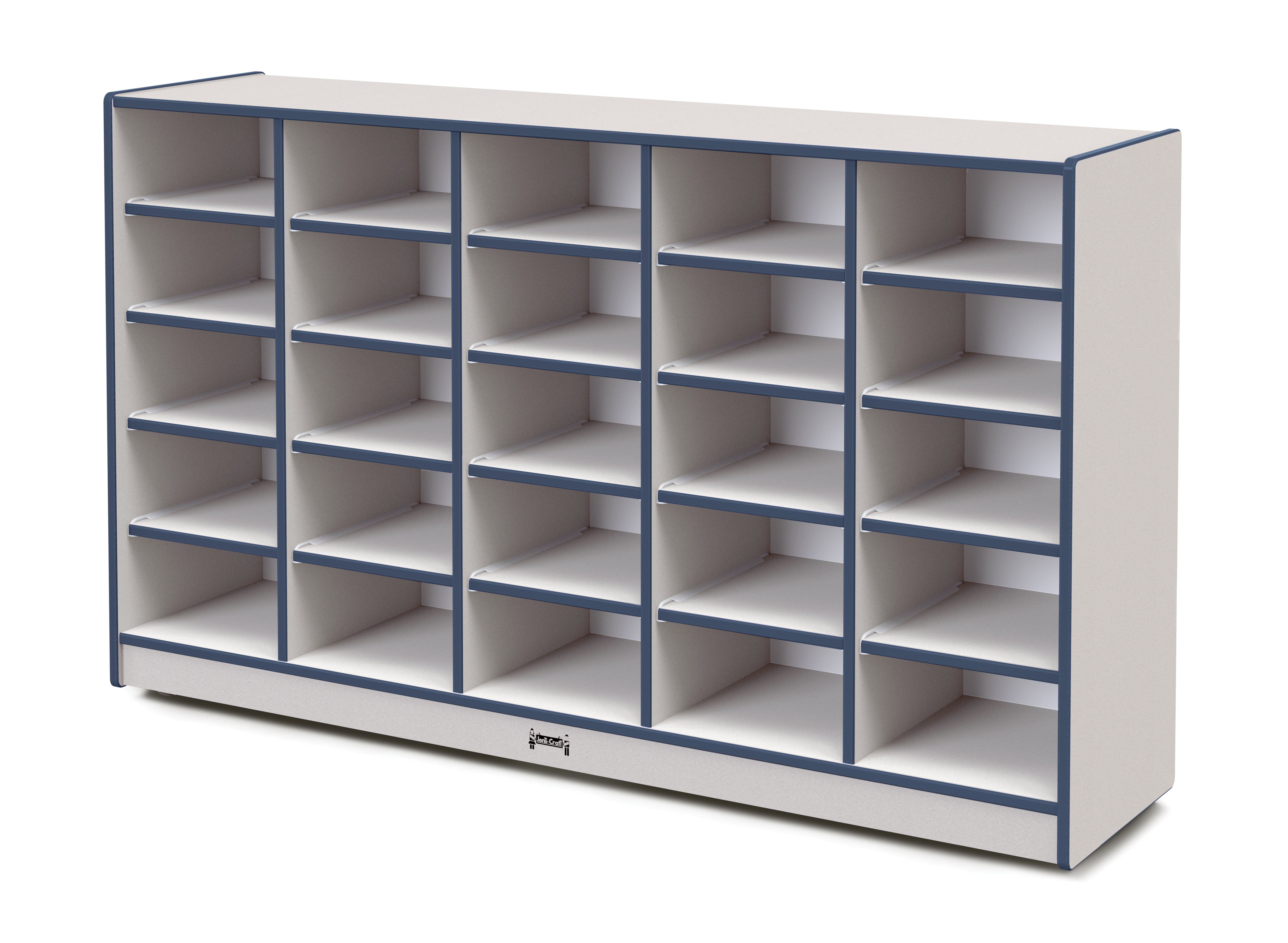 Organize art supples, papers, or manipulatives with this mobile unit! Features 25 Tub openings that papers (8.5" x 11") can lay flat, without curled edges. Tubs not included. Constructed of double-sided freckled gray laminate with navy TRUEdge.KYDZSafe edges. KYDZStrong construction. TrueEdge. MAXBracket