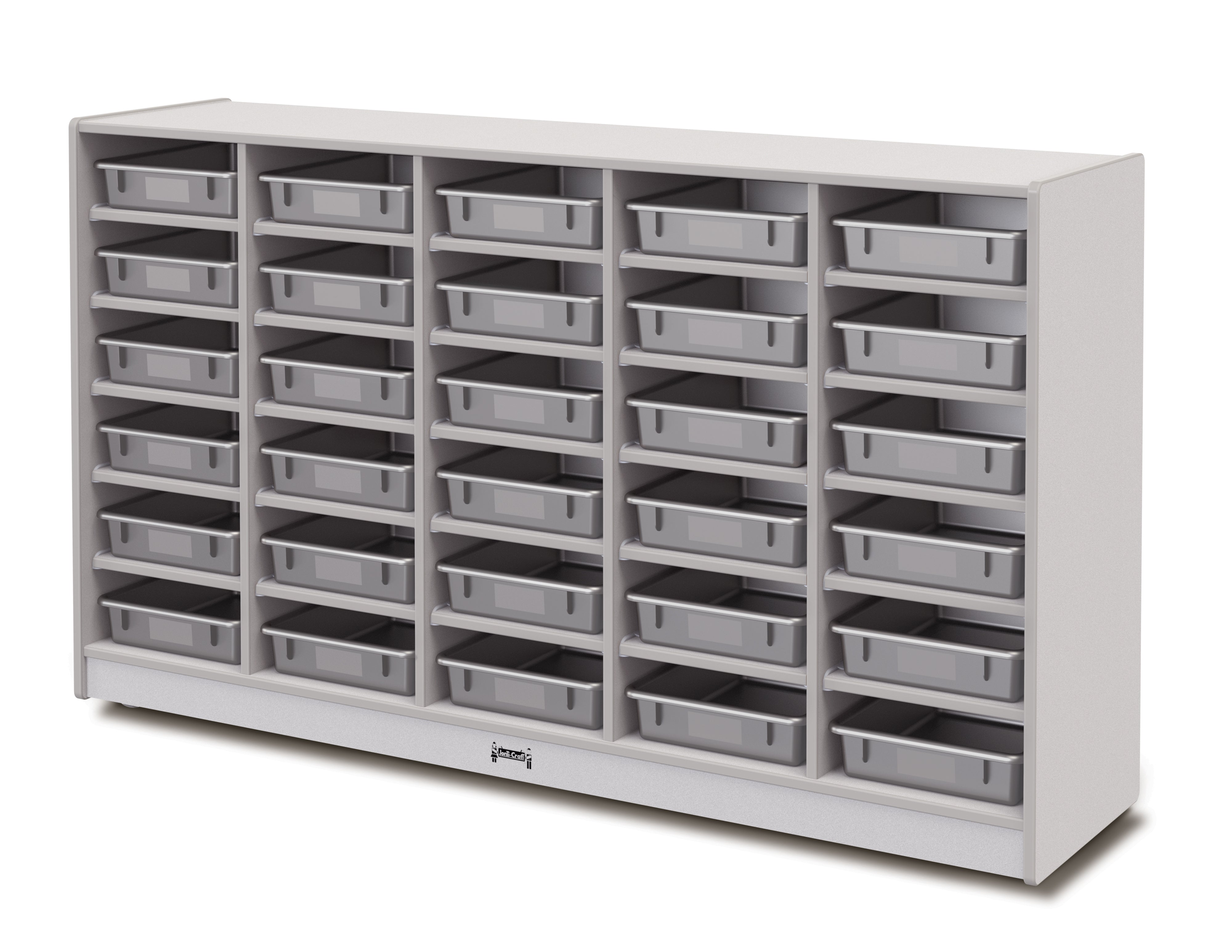 Storage space for take home papers for thirty students! The 30 included Paper-Trays fit letter sized paper without bending or folding. Also great for assignments, art paper, and computer centers. Constructed of double-sided freckled gray laminate with gray TRUEdge.KYDZSafe edges. KYDZStrong construction. TRUEdge. MAXBracket. Constructed of 5/8Ó thick freckled-gray Thermally Fused Laminate (TFL). Contact your Jonti-Craft dealer for specific bin colors. Standard Write-n-Wipe recessed backs. Back options available. See cleaning recommendations at www.jonti-craft.com/cleaning.