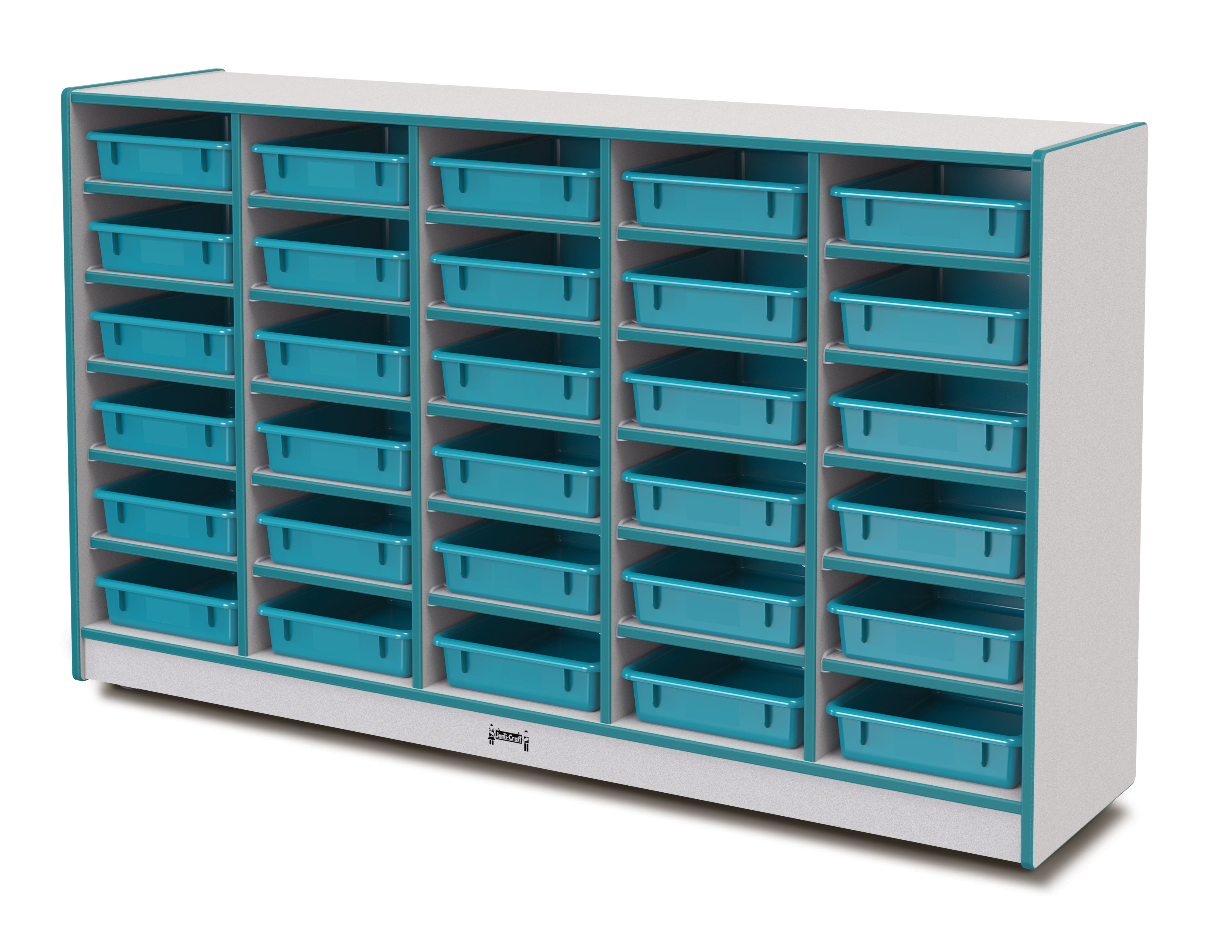 Storage space for take home papers for thirty students! The 30 included Paper-Trays fit letter sized paper without bending or folding. Also great for assignments, art paper, and computer centers. Constructed of double-sided freckled gray laminate with teal TRUEdge.KYDZSafe edges. KYDZStrong construction. TRUEdge. MAXBracket. Constructed of 5/8Ó thick freckled-gray Thermally Fused Laminate (TFL). Contact your Jonti-Craft dealer for specific bin colors. Standard Write-n-Wipe recessed backs. Back options available. See cleaning recommendations at www.jonti-craft.com/cleaning.