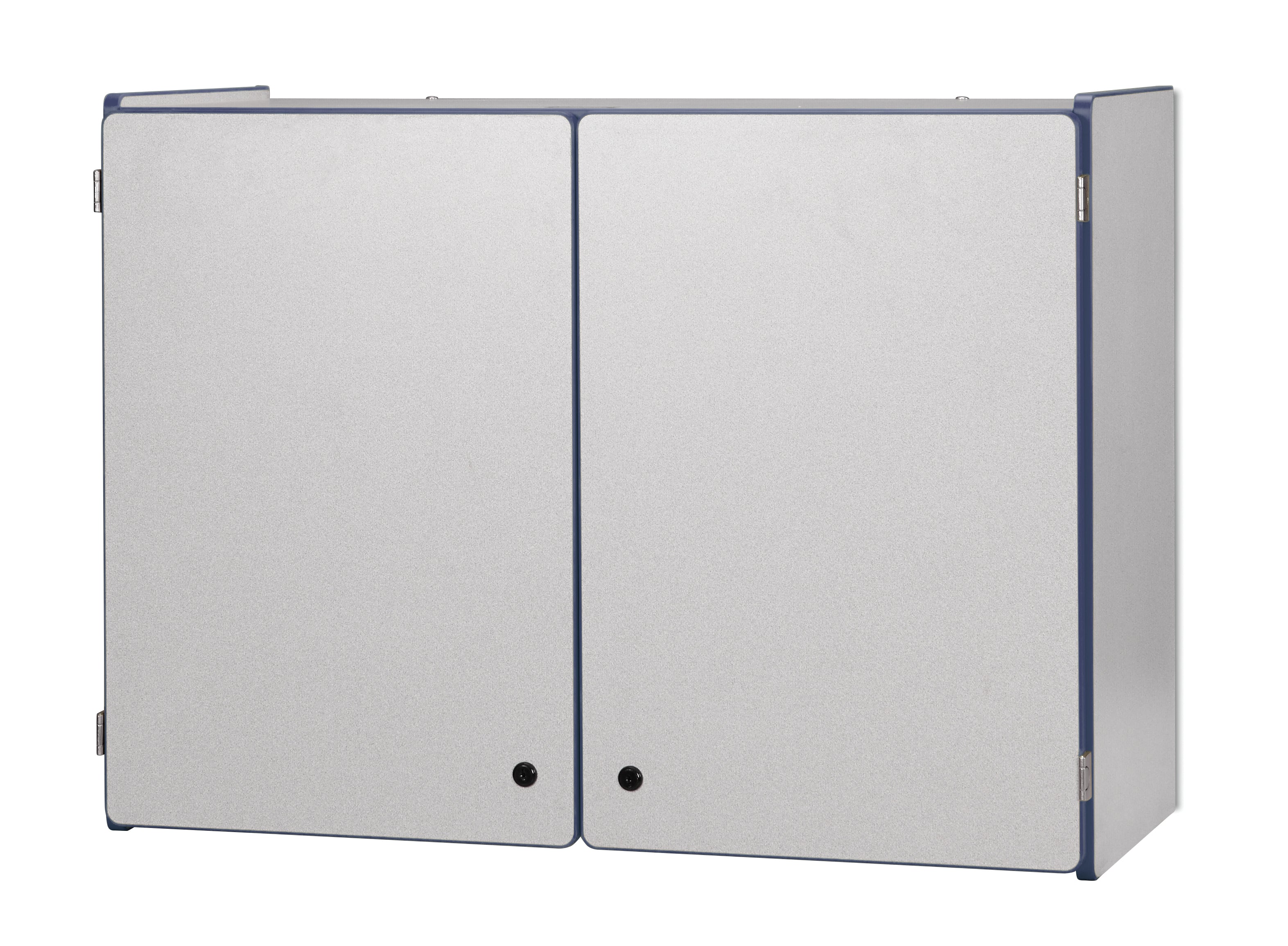 Safeguard supplies in this lockable wall cabinet. Perfect for storing above a Diaper Changer for additional storage. Features two adjustable shelves to allow for storing items of various sizes. Lock-n-key and easy to mount wall bracket included. Constructed of double-sided freckled gray laminate with navy TRUEdge.KYDZSafe edges. KYDZStrong construction. TRUEdge. Constructed of 5/8Ó thick freckled-gray Thermally Fused Laminate (TFL). See cleaning recommendations at www.jonti-craft.com/cleaning.