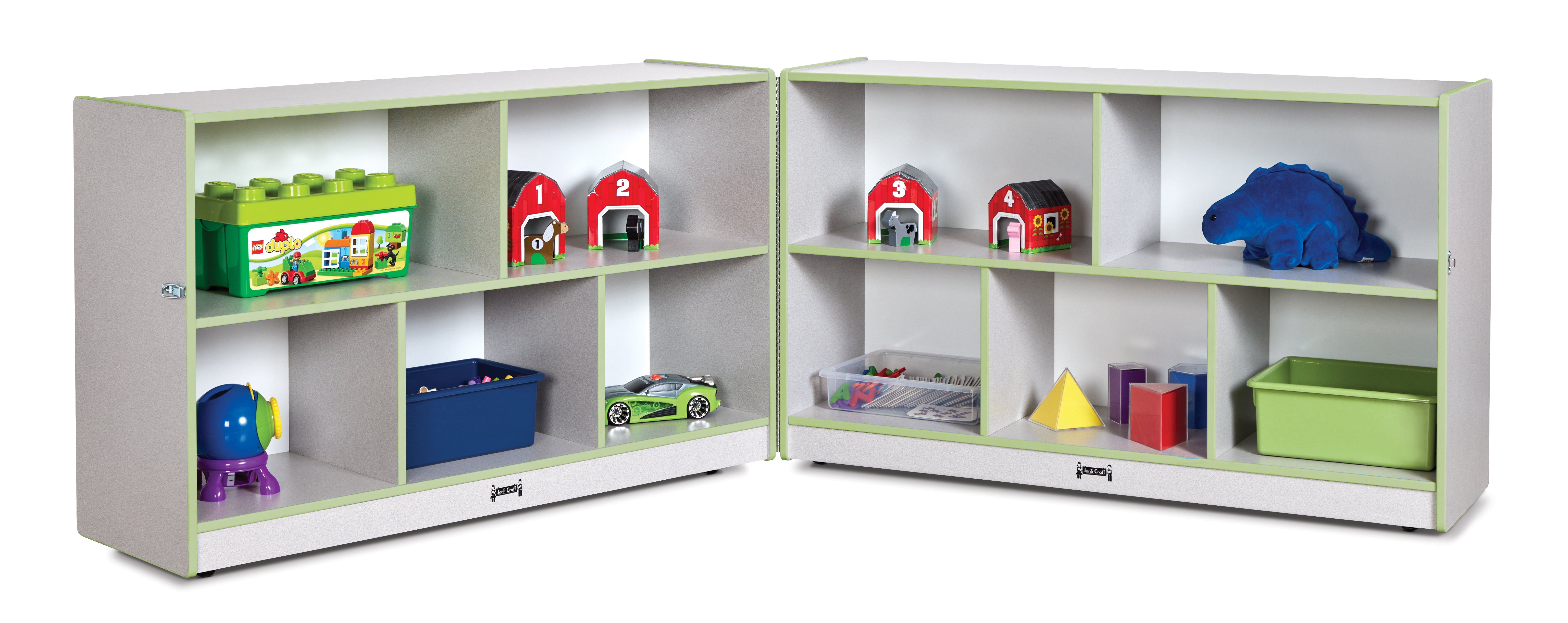 Extra storage perfect for multi-purpose rooms! Fold the wings together and lock the hasp when security is desired. Each wing is 48" wide x 15" deep x 29.5" high, unit opens to eight feet. Constructed of double-sided freckled gray laminate with key lime TRUEdge.KYDZSafe edges. KYDZStrong construction. KYDZHinges. TRUEdge. MAXBracket. Constructed of 5/8Ó thick freckled-gray Thermally Fused Laminate (TFL). Standard Write-n-Wipe recessed backs. Back options available. Locking hasp. See cleaning recommendations at www.jonti-craft.com/cleaning.