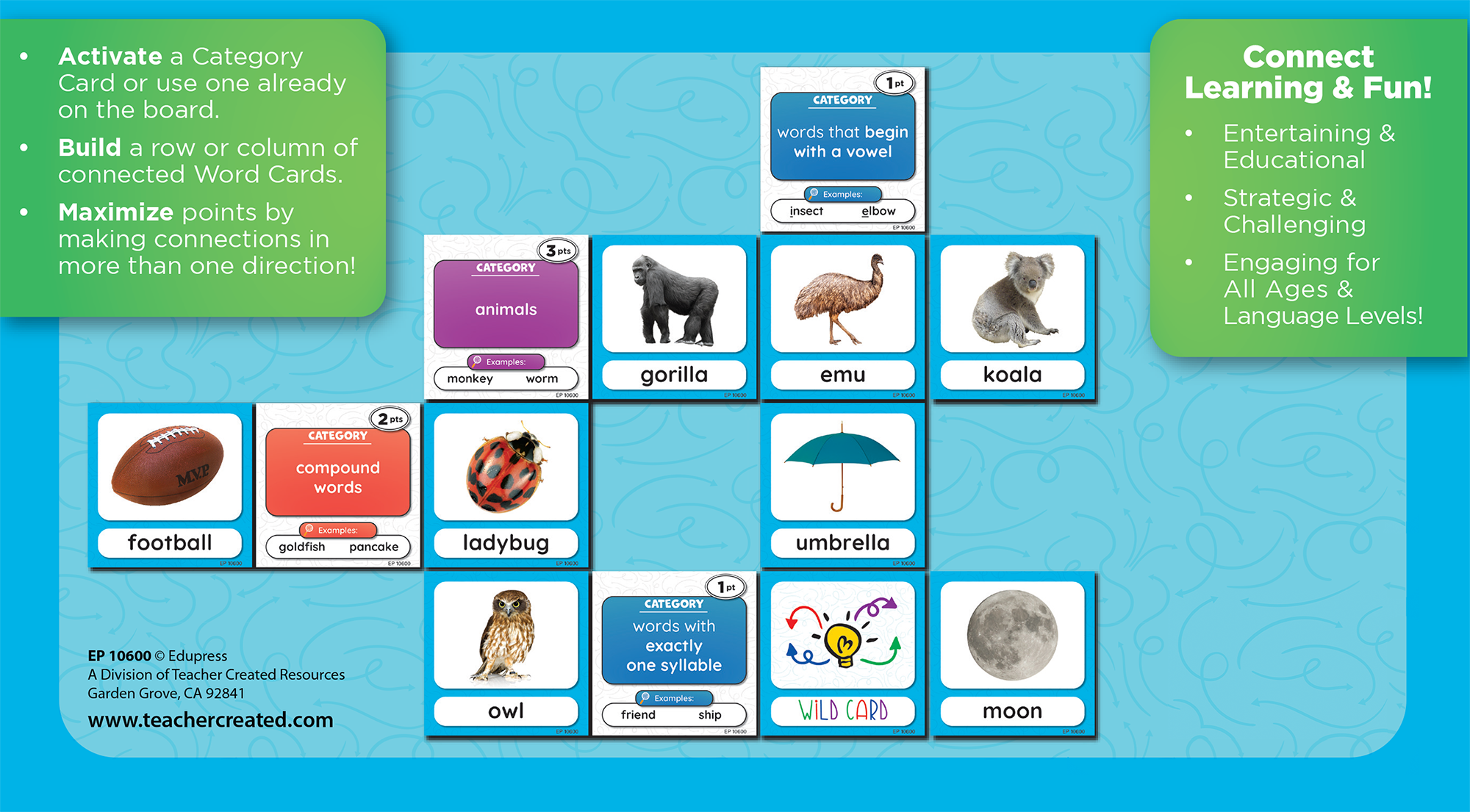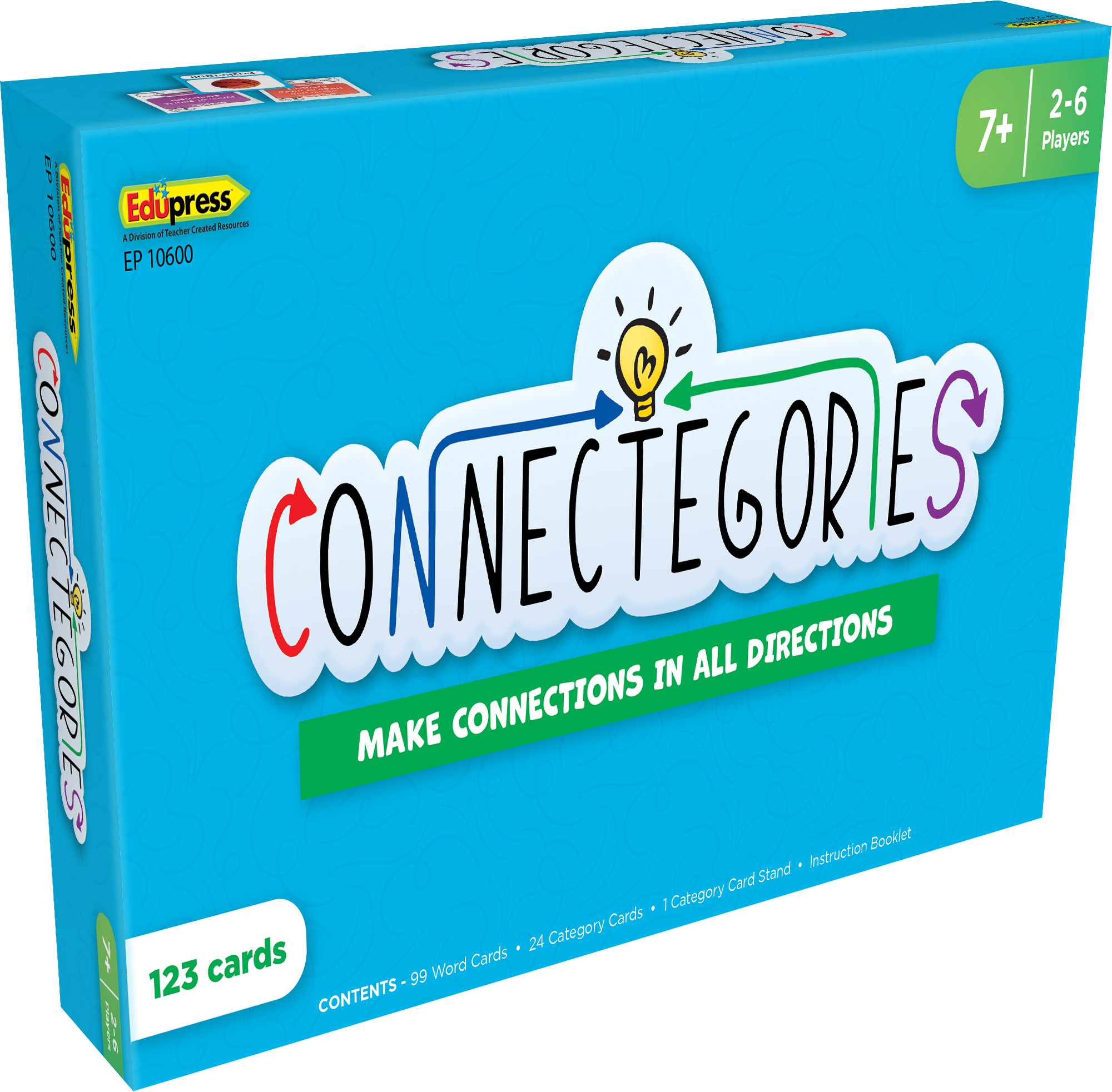 Connectegories is a strategic word game that will get learners of all ages to find and make connections between words. The game includes 99 Word Cards (each featuring the spelling and photo of a common word), 24 Category Cards (each naming a category based on the meaning or construction of the words), and a Category Card Stand. Players activate a new Category Card or use one already on the board. They then connect Word Cards that fit into those categories and try to maximize points by making connections in more than one direction. Watch a web of words grow as the connections take hold! Includes 1 category card stand and an instruction booklet.