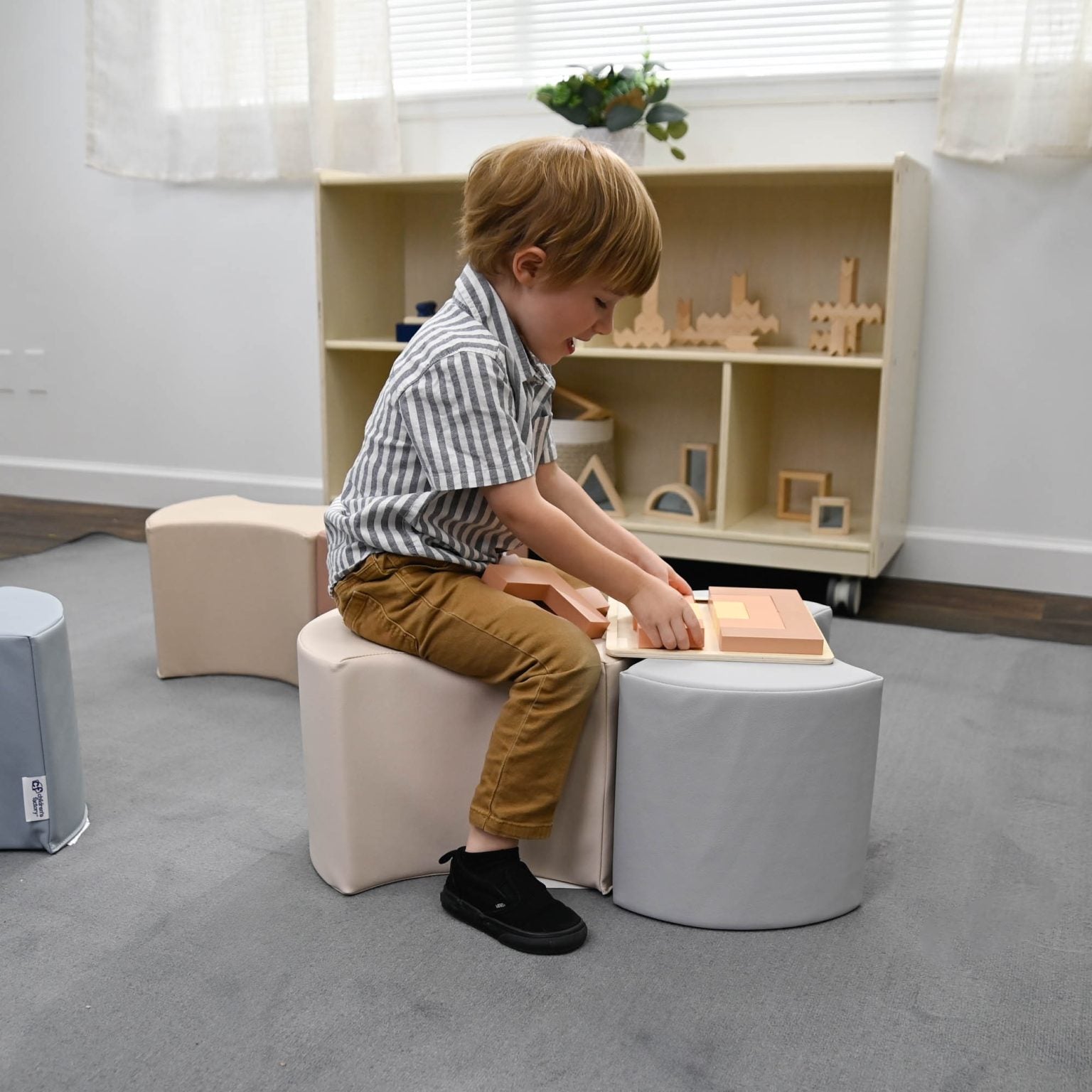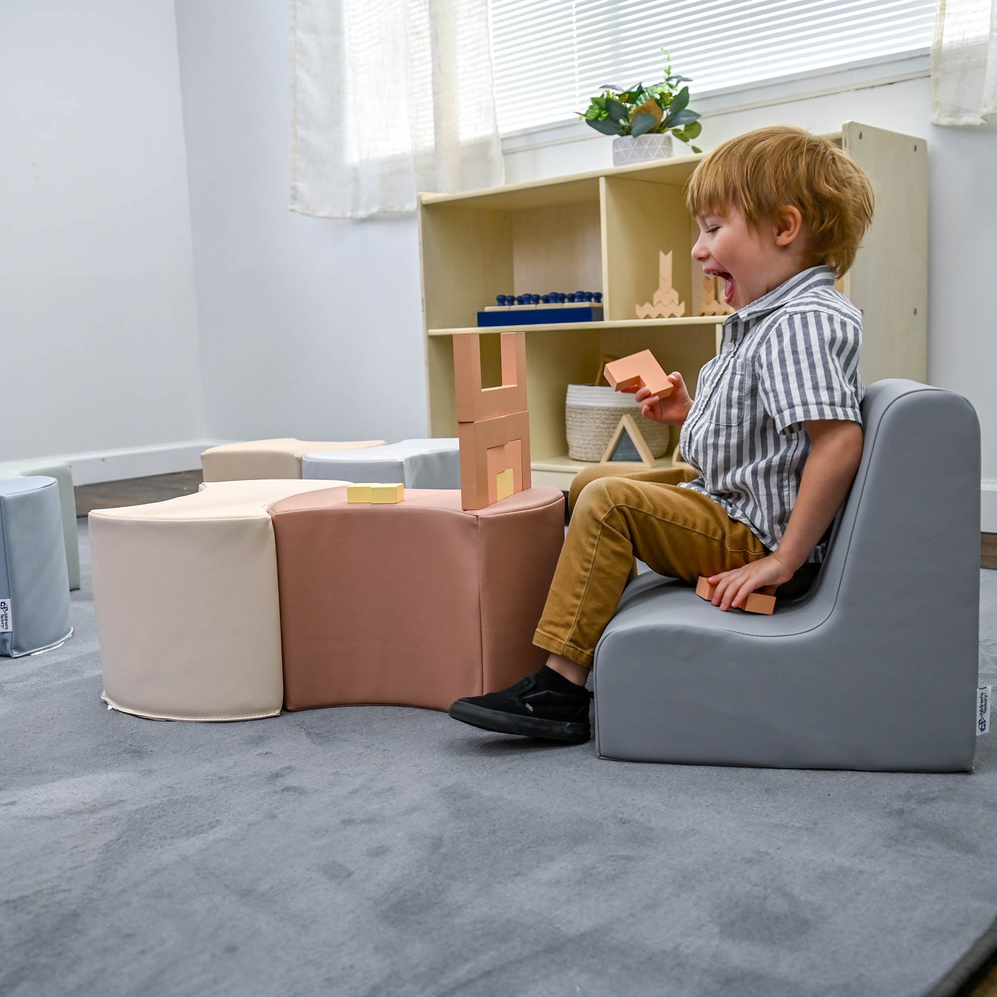 Design a space that adapts to the way kids learn, play, and grow with our Bowtie Seating set. This cleverly crafted, interlocking set includes six modular seats that fit together like puzzle pieces—creating endless seating arrangements to suit your needs. Use them in a straight line for individual seating, form a circle around a central ottoman, or design your own custom configuration. Each seat features a 10″ height, perfect for preschoolers and early learners. Upholstered in soft, durable, and eco-friendly vegan leather, these seats are easy to wipe clean and disinfect, making them ideal for classrooms, libraries, or reading corners. Whether used for story time, collaboration, or quiet rest, Bowtie Seating encourages creativity, social interaction, and spatial exploration.