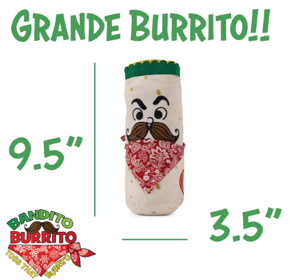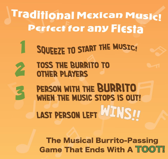 • A Hilarious Musical Game: Get ready for a fiesta of laugh-out-loud fun with Bandito Burrito - the burrito-passing game! Squeeze the plush burrito to start the lively traditional Mexican music, then throw the burrito from player to player. Don’t be the last one holding it when the music stops and the toot sounds, or you’re out! The last player standing wins!