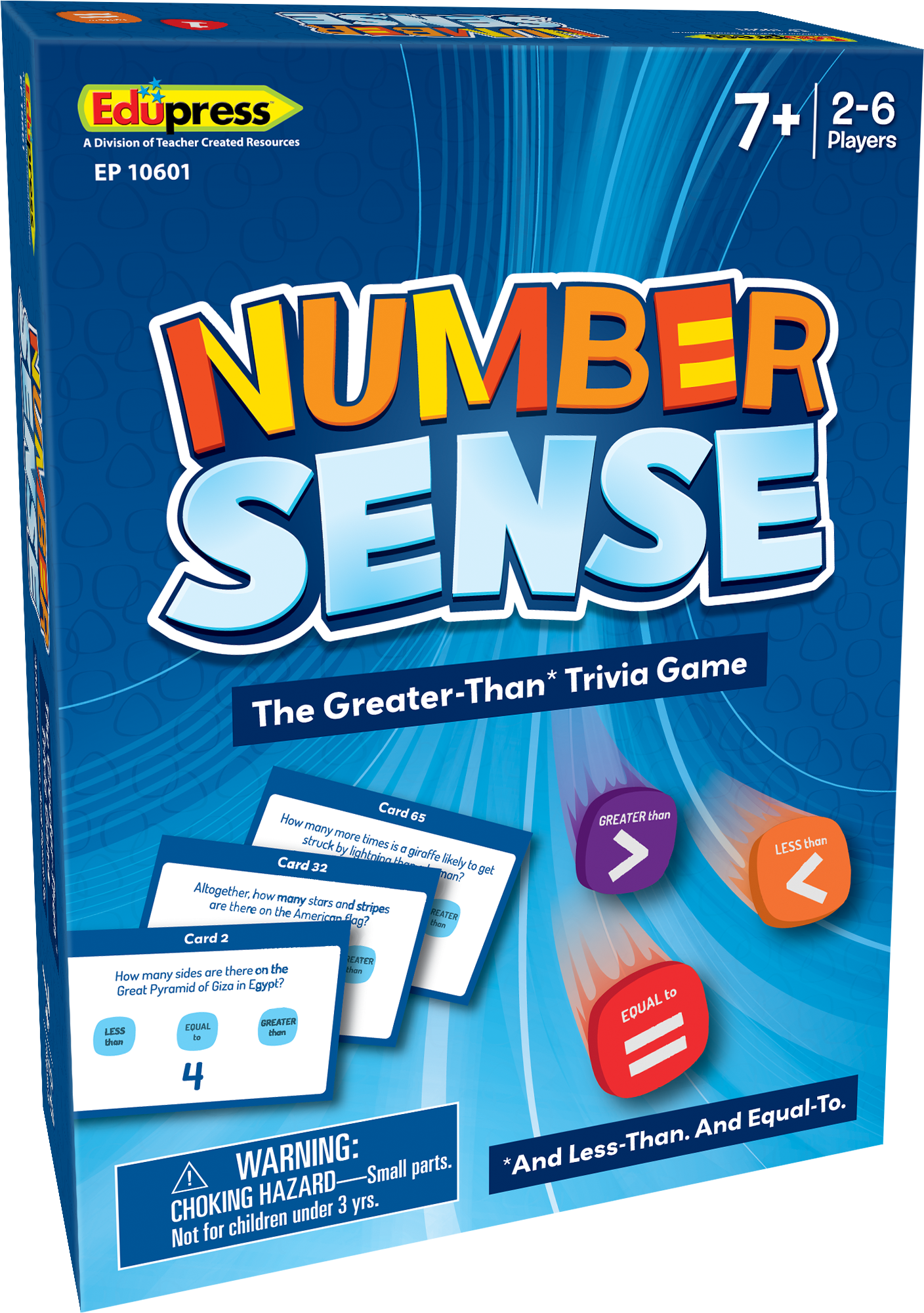 Number Sense is a trivia game that gives all the answers but not all are correct! Each trivia question is a fascinating fact with a numerical answer; and it's up to players to decide if that number is too high, too low, or just right. Each player's number sense will be tested as they earn (or lose) points based on how sure they know the right answer. Includes 80 trivia cards (3" x 4-1/2"), 6 player boards (5" x 7"), 48 foam game pieces (approx. 1-1/4" x 1-1/4"), and an instruction sheet.
