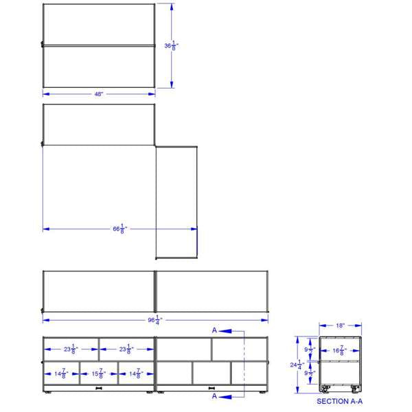 Lockable storage at a toddler's height. Each wing is 48" wide x 15" deep x 24.5" high. Opens to eight feet.