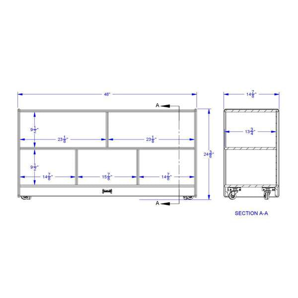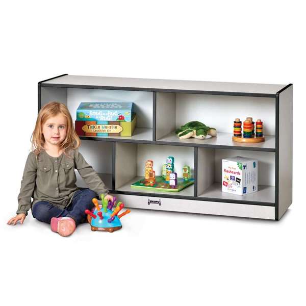 Just the right storage height for toddlers! Books, toys, games, and more fit perfectly on this storage unit with two shelves and five open compartments. Constructed of double-sided freckled gray laminate with black TRUEdge.