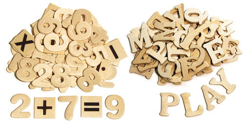 Wood letters and numbers are 11‚ÅÑ2" tall and include 3 sets of capital letters, 2 sets of lower case letters, 5 sets of numbers 0-9 and 4 each of math symbols +, -, x, = and ‚ÅÑ. 200 pieces.