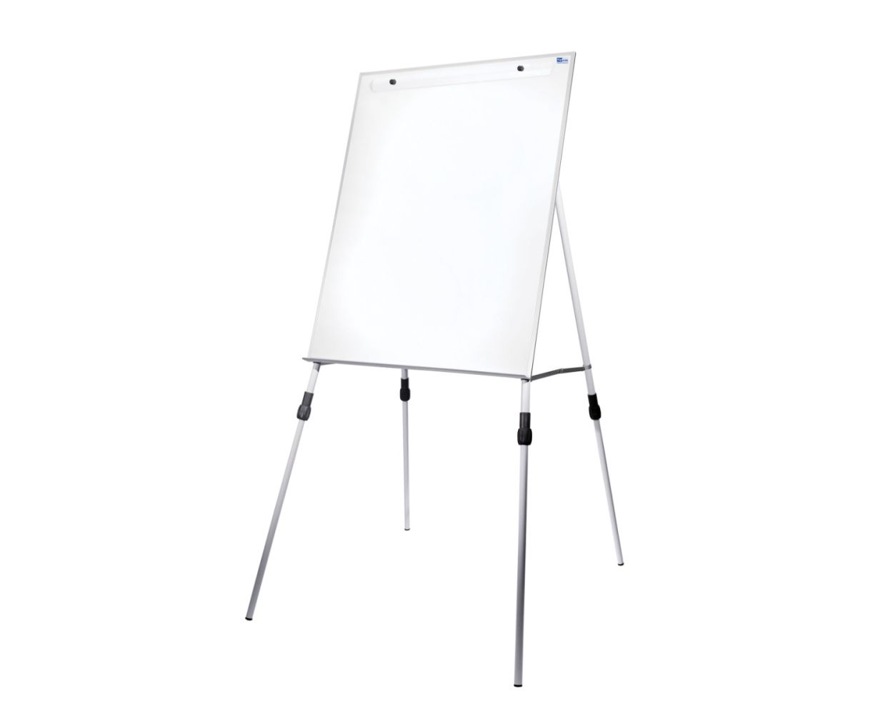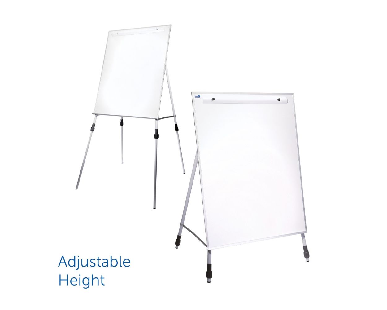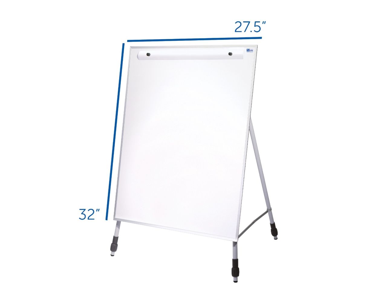 Multi-use, adjustable-height easel offers presentation options you can take anywhere! Sleek 1/2" aluminum frame surrounds a quality, non-ghosting dry erase board. Bottom marker tray spans the entire width and will support posters and large-format books. Locking safety hinges ensure stability and fold for storage. Steel tubing legs feature anti-skid tips and are height adjustable for use on the floor or table top. Dry erase surface is 27.5" wide x 32" high with a pressure-regulated steel strip along the top edge to hold tablets in place with thumbscrews.