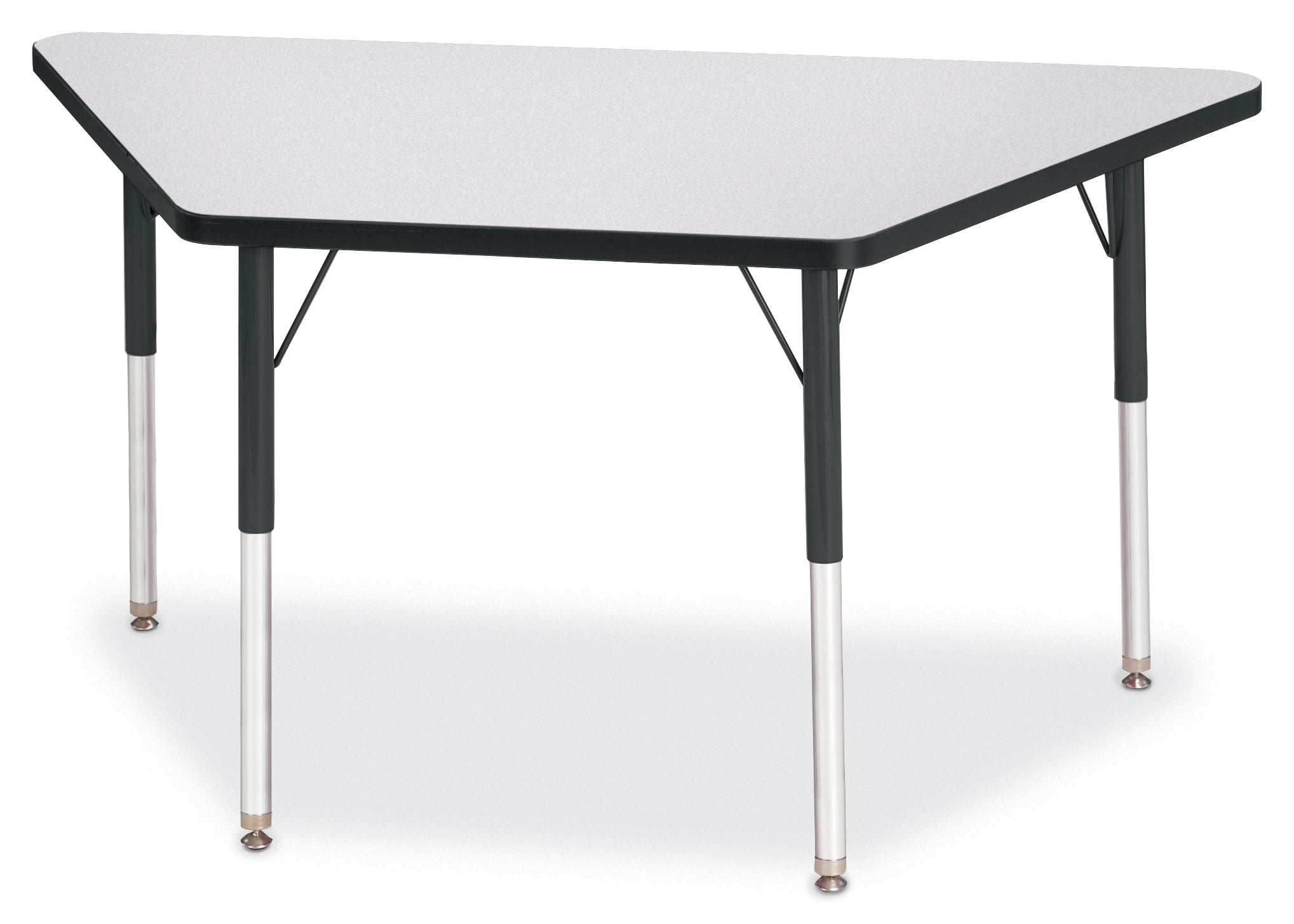 Great for students of any age, multiple trapezoid tables can be arranged in many configurations to accommodate any space. Accommodates up to 2 chairs. The legs feature glides that reduce noise, prevent snags, and resist rust. Freckled gray laminate tabletop with black TRUEdge and black legs.KYDZSafe edges. KYDZStrong construction. TRUEdge. Choose from multiple tabletop and TRUEdge color combinations. Thermally Fused Laminate tabletops 1-1/8â thick. Quick mount legs with minimal assembly. Legs adjust in one-inch increments with the extra-safe dual-screw leg adjustability system. Helpful Hint: Most children require elementary size tables tiny tables typically fit children just 1 to 2 years old. Adjusts from 24" to 31" high. See cleaning recommendations at www.jonti-craft.com/cleaning.Product Height (inches):24-31Product Width (inches):48Product Depth (inches: 24