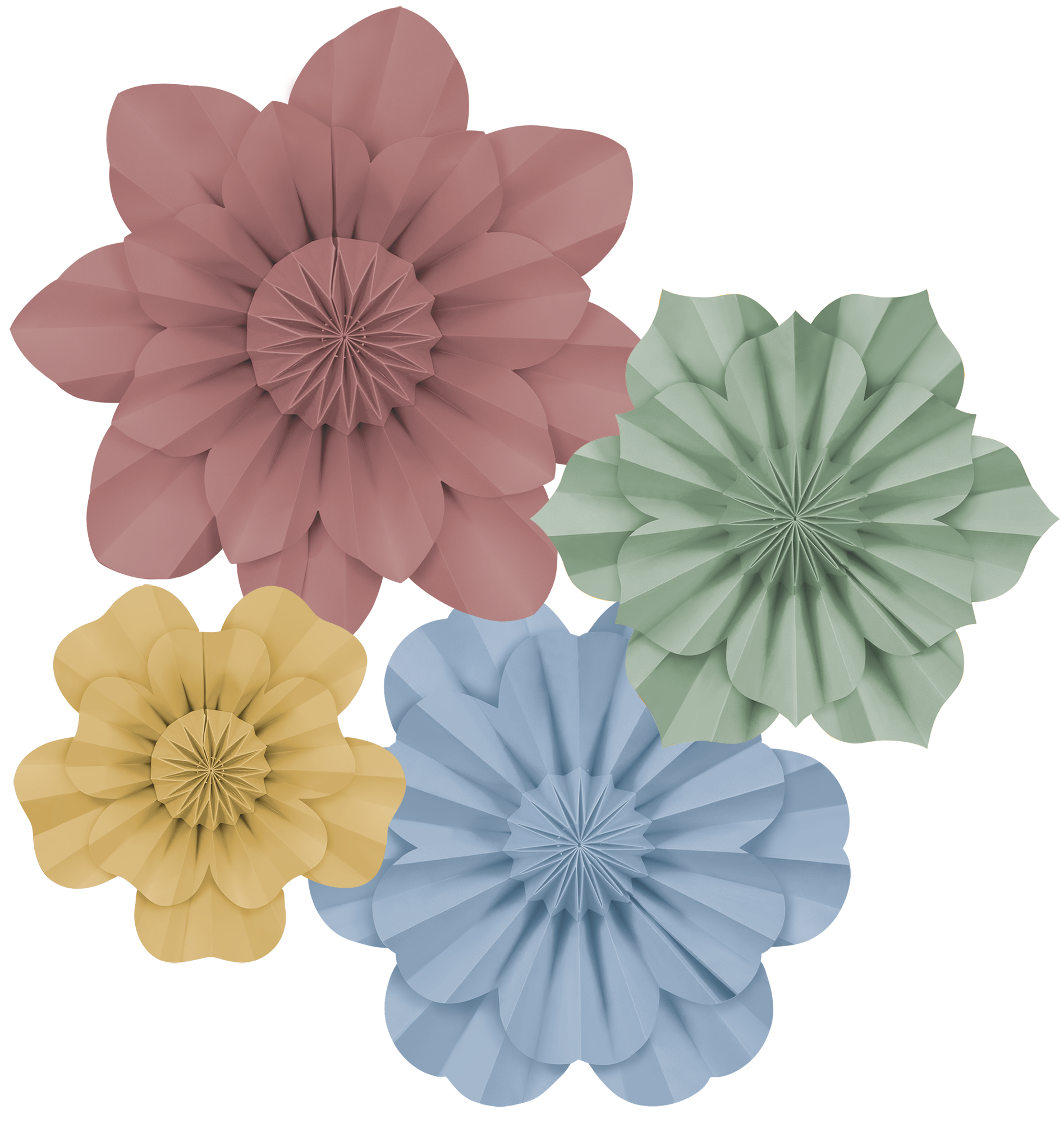 Create a colorful and unique look with these gorgeous paper flowers. Add depth and dimension to walls, backdrops, table decorations, and much more! No assembly requiredÑopens easily and stays together with a hidden magnet. Folds back up for easy storage, so they can be used again and again. Four flowers per pack. Each pack includes one 16", two 11", and one 8" in diameter.