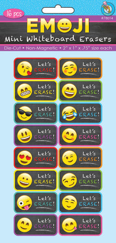 Emoji Mini Whiteboard Erasers. Great for little hands!  Each eraser measures 2" x 1-1/2" x 3/4". 16 erasers per pack.