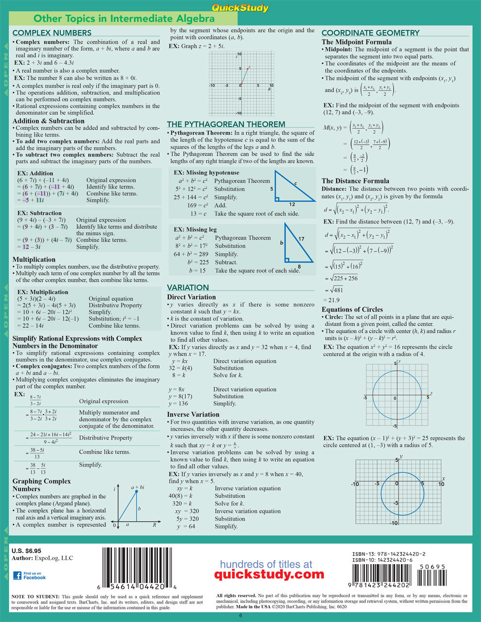 In college or college bound, the importance of algebra in an academic career is so large it can determine your future path and college major. This solid prerequisite course can pave the way for better grades throughout school whether math is second nature or a challenge, and in either case this is your go-to reference for answers at your fingertips all in 6 durably laminated pages. The math experts at ExpoLog, who write and edit for textbook publishing companies and who have authored many best selling and highly reviewed QuickStudy math guides authored the targeted content that is the backbone of support you need at a price lower than any college level study tool you will find anywhere, making it easy to add this guide to your college success toolbox.