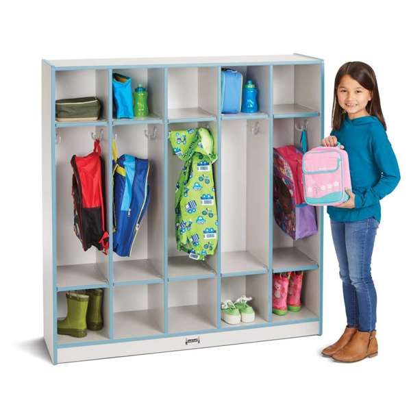 Neatly store jackets, backpacks, boots, and lunchboxes with this classic locker with space for five children. Two double coat hooks in each section provide adequate hanging storage and the open compartments above and below store boots and lunchboxes. Constructed of double-sided freckled gray laminate with coastal blue TRUEdge.KYDZSafe edges. KYDZStrong construction. TRUEdge. Constructed of 5/8” thick freckled-gray Thermally Fused Laminate (TFL). Double coat hooks. Stationary. Standard Write-n-Wipe recessed backs. Back options available. See cleaning recommendations at www.jonti-craft.com/cleaning.