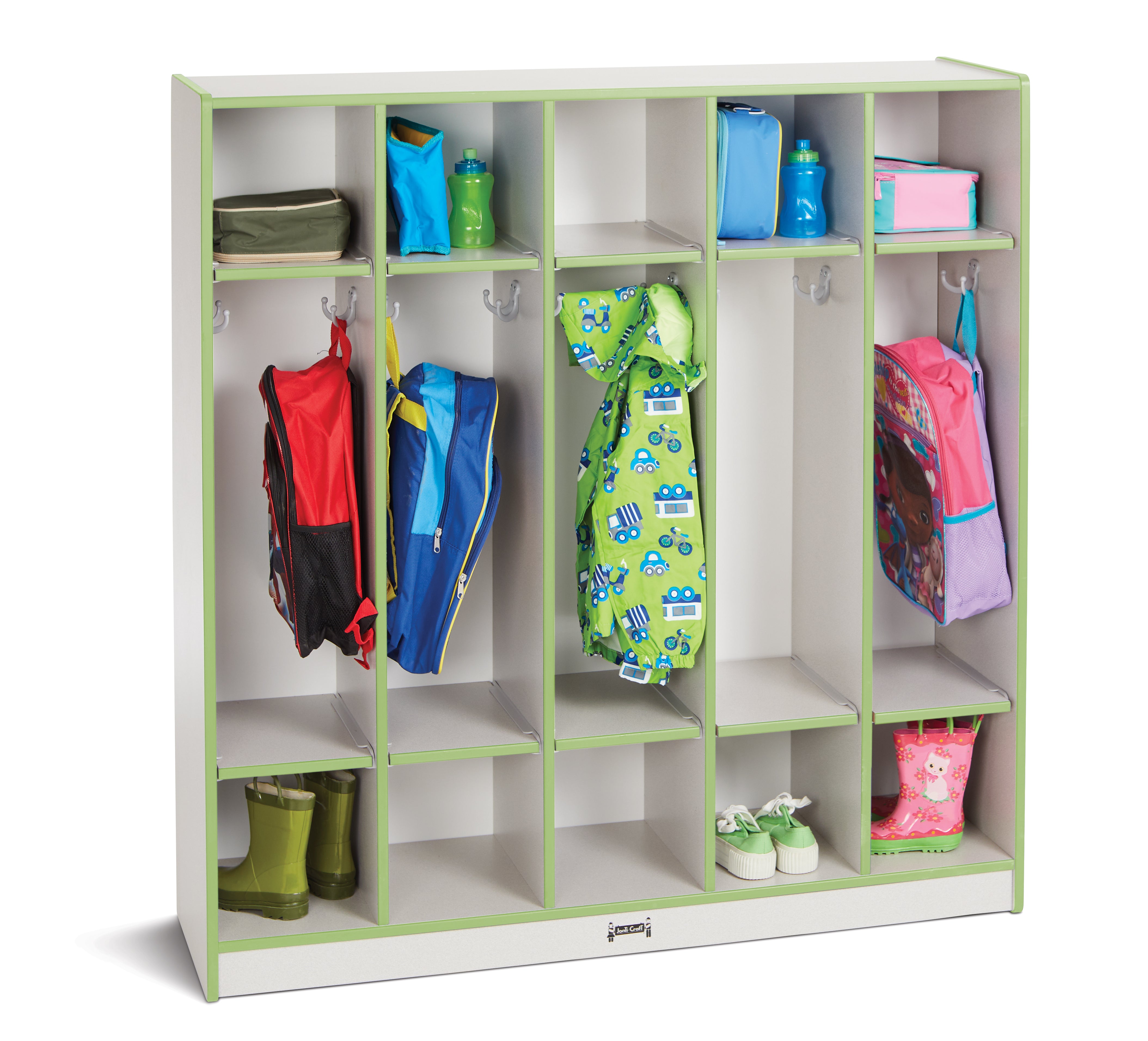 Neatly store jackets, backpacks, boots, and lunchboxes with this classic locker with space for five children. Two double coat hooks in each section provide adequate hanging storage and the open compartments above and below store boots and lunchboxes. Constructed of double-sided freckled gray laminate with key lime TRUEdge.KYDZSafe edges. KYDZStrong construction. TRUEdge. Constructed of 5/8” thick freckled-gray Thermally Fused Laminate (TFL). Double coat hooks. Stationary. Standard Write-n-Wipe recessed backs. Back options available. See cleaning recommendations at www.jonti-craft.com/cleaning.