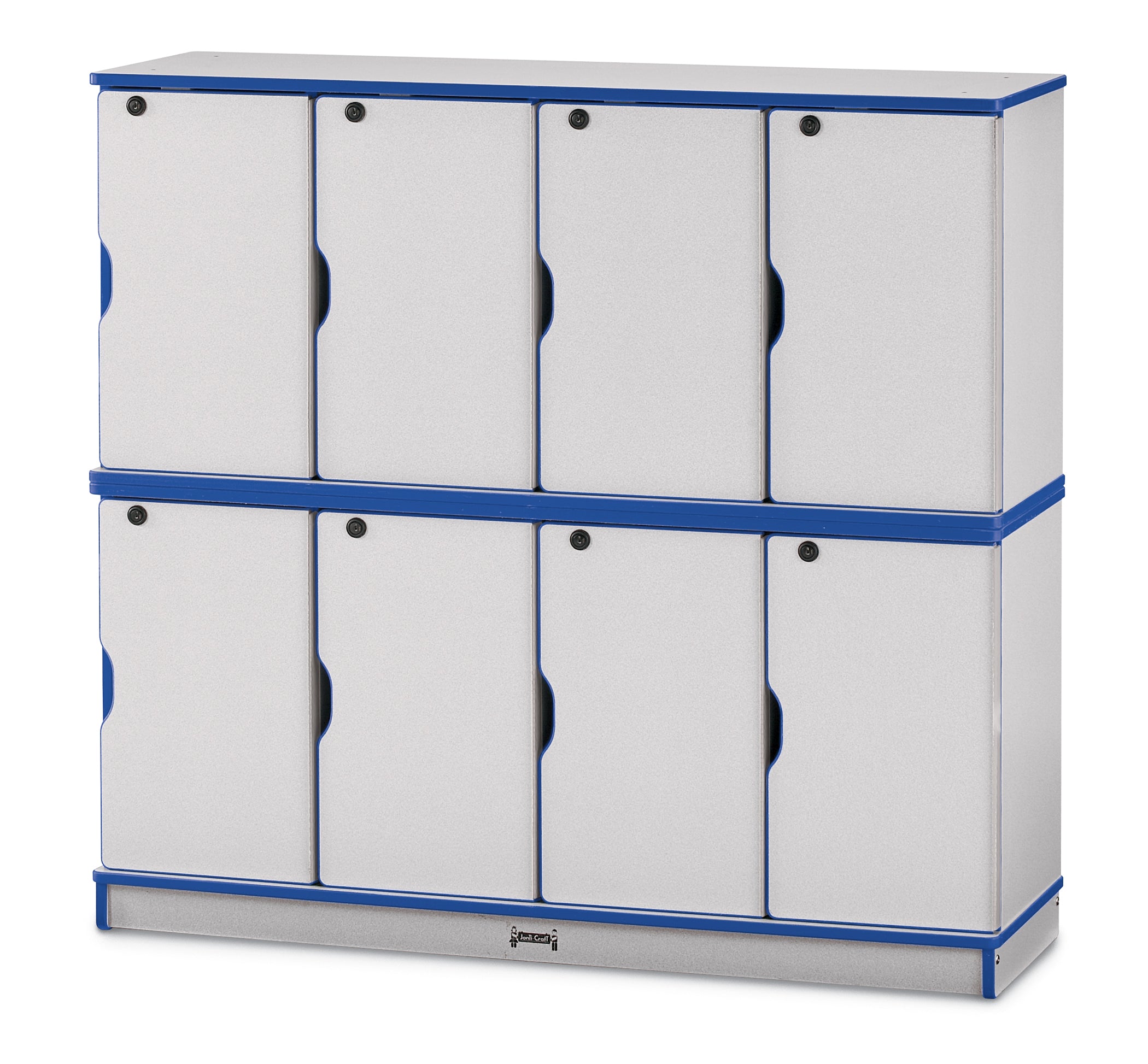 This Double stack of lockers provides secured storage space for eight kids. Different locks and keys are provided for secured lockers. Individual lockers are 10.5" wide x 12.5" deep x 20" high. Stacked lockers must be fastened to a wall. Note: The units have four holes in the top of the unit for fastening stacked lockers.KYDZSafe edges. KYDZStrong construction. KYDZHinges. TRUEdge. Constructed of 5/8” thick freckled-gray Thermally Fused Laminate (TFL). Stationary. See cleaning recommendations at www.jonti-craft.com/cleaning.