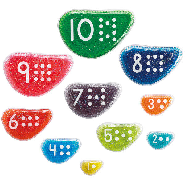 Clear plastic pebble-shaped pillows that contain gel-like beads in 10 different colors. Numerals 1-10 and the corresponding number of dots are printed on one side. Sizes: 8.25”L x 5.25”W – 2.5”L x 1.6”W.