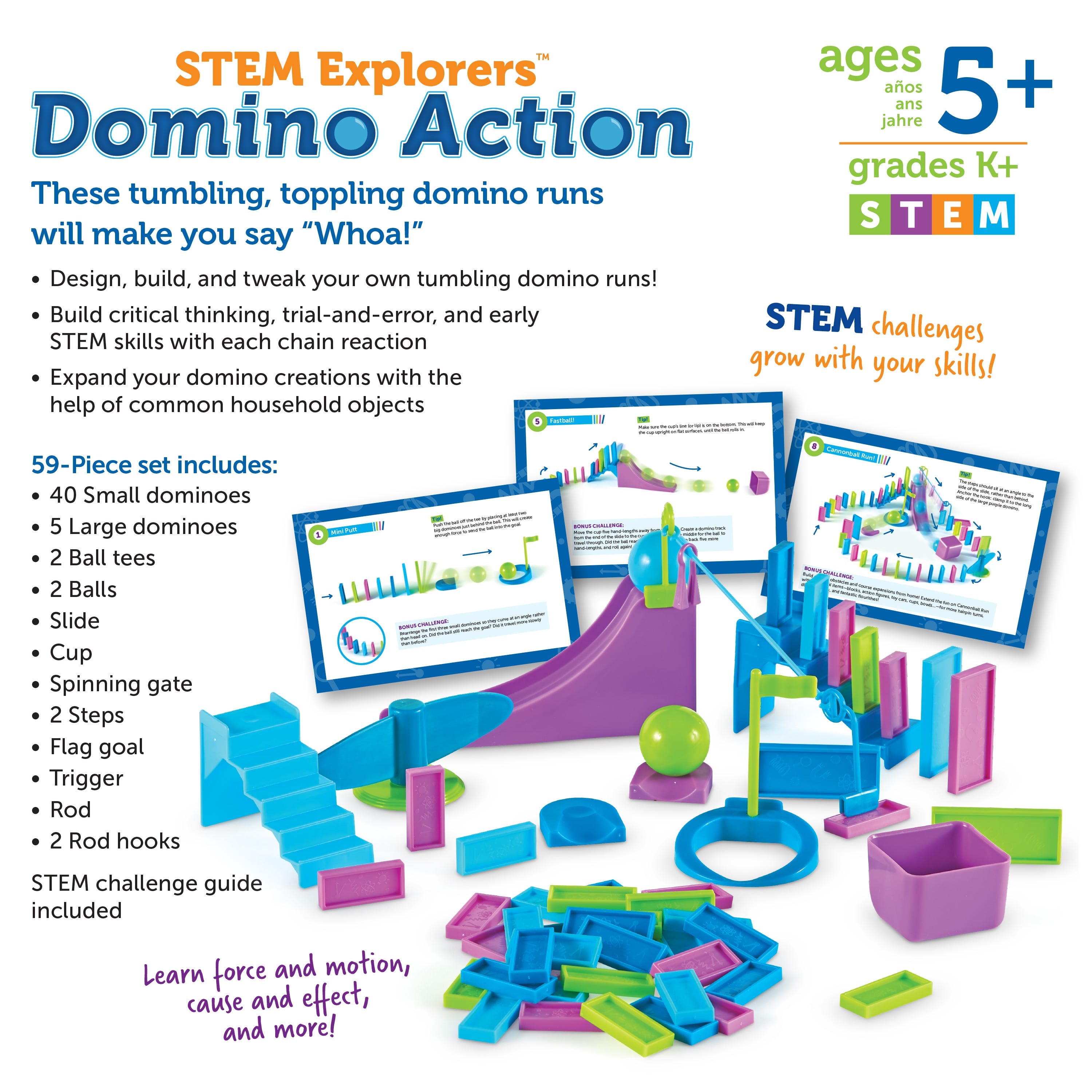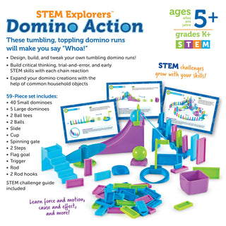 These STEM challenges are a domino dash! Build a domino sequence and set off a chain reaction that demonstrates STEM principles including cause and effect, force and motion, and more. This 59-piece set includes 45 dominoes, 14 STEM-focused building components, and STEM challenge cards with critical thinking puzzles!