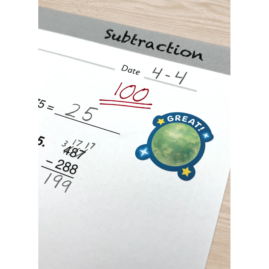 Give students a galactic boost with these positive stickers. Featuring vibrant, colorful planets and motivational words, these stickers are excellent for grading papers, decorating assignments, or adding a touch of fun to classroom activities. Spread space-themed positivity to celebrate creativity, effort and everyday accomplishments. The pack includes 120 stickers in 20 designs. Measurements vary from about 1-1/2" to 7/8".