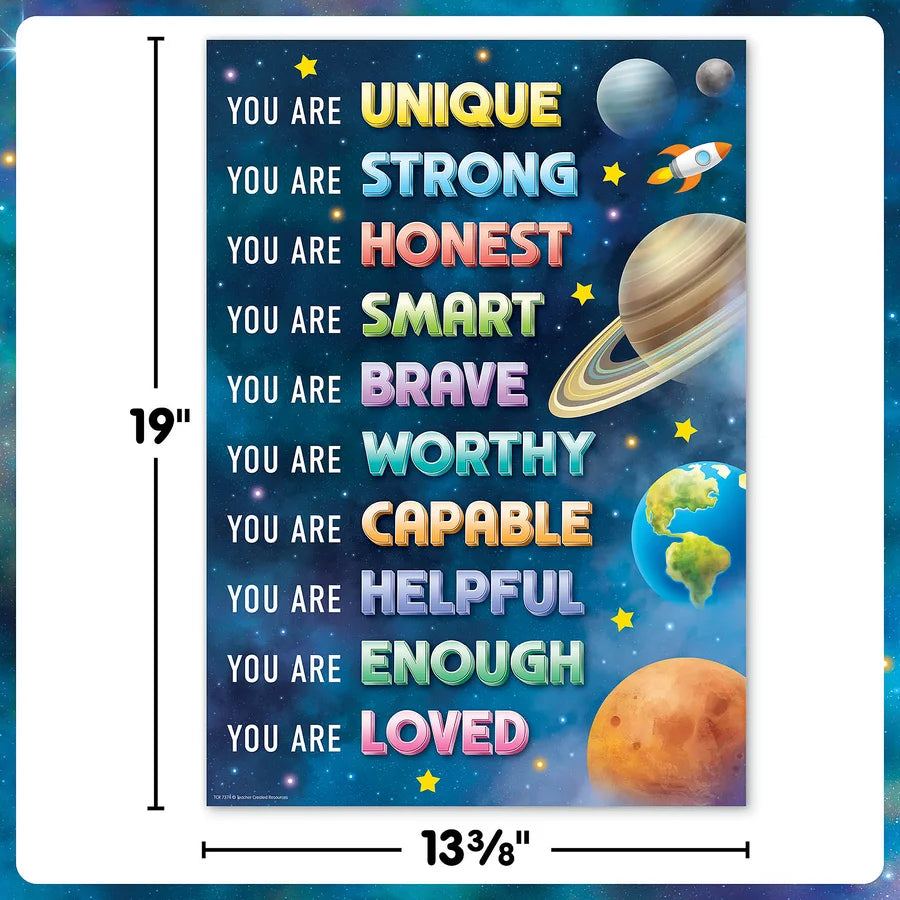 Remind every student of their limitless potential with this positive poster. Featuring blended blue and purple hues, pops of color, and easy-to-read text, this poster offers 10 encouraging "you are" statements that tell students they matter. Hang on a bulletin board, wall, or door to foster feelings of acceptance. Pair with a mirror to create an affirmation station, or use for SEL activities that build self-worth. Each poster measures 13-3/8" x 19".